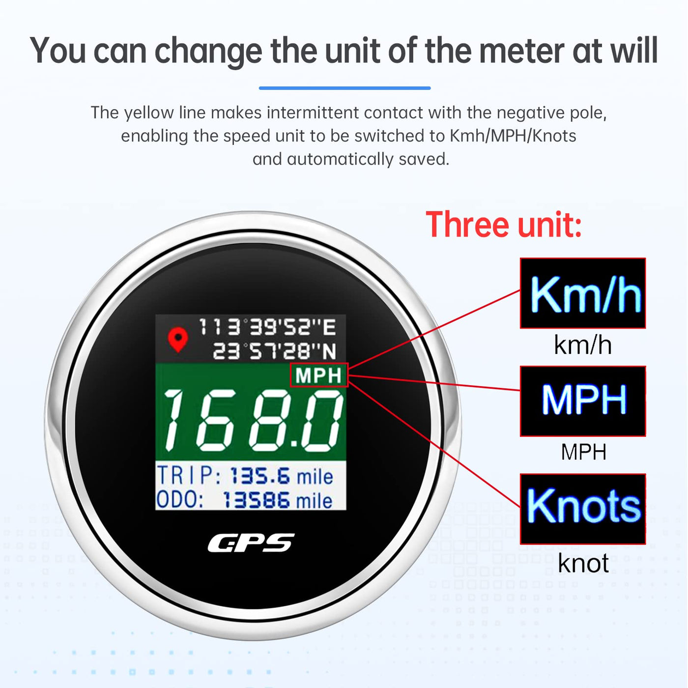 Q: How does the unit switching between MPH, Knots, and Km/h work?A: You can easily switch between MPH, Knots, and Km/h using a backside button on the speedometer. Additionally, by connecting the yellow line intermittently to the negative electrode, the unit can be changed, and the setting will be automatically saved.