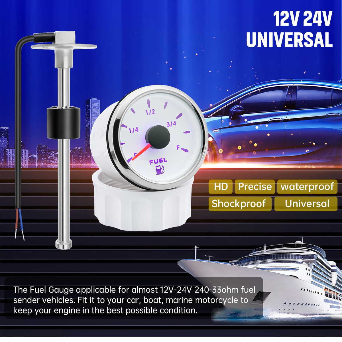 Marine Fuel Sending Unit Specifications: - Protection ank: IP67 - Resolution range: 21 mm - Assembly: SAE standard 5 holes - Rated current for alarm switch: 500mA - Output signal: 240~33 ohm (Standard American) - Operating temperatures: - 40 to 85 Celsius - Fit for Fuel Level Gauge and Water Level Gauge - Mounting: 5 pieces of M5 screws and 2 mm thick gasket Specification Fixing dimension: 52mm(2'') Face Color: white Working voltage: 9~32v/ 12-24V Input signal:240-33ohm Working current:=60mA Operating temperature:-30?~+75? Storage temperature:-40?~+85? Grade of protection:IP67 Package includes 1 x Fuel Sending Unit 1 x Fuel level gauge 1 x Wiring harness 1 x Instruction manual