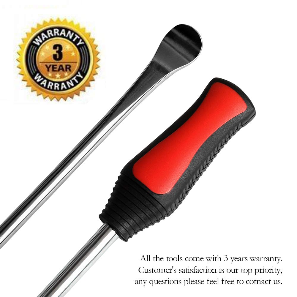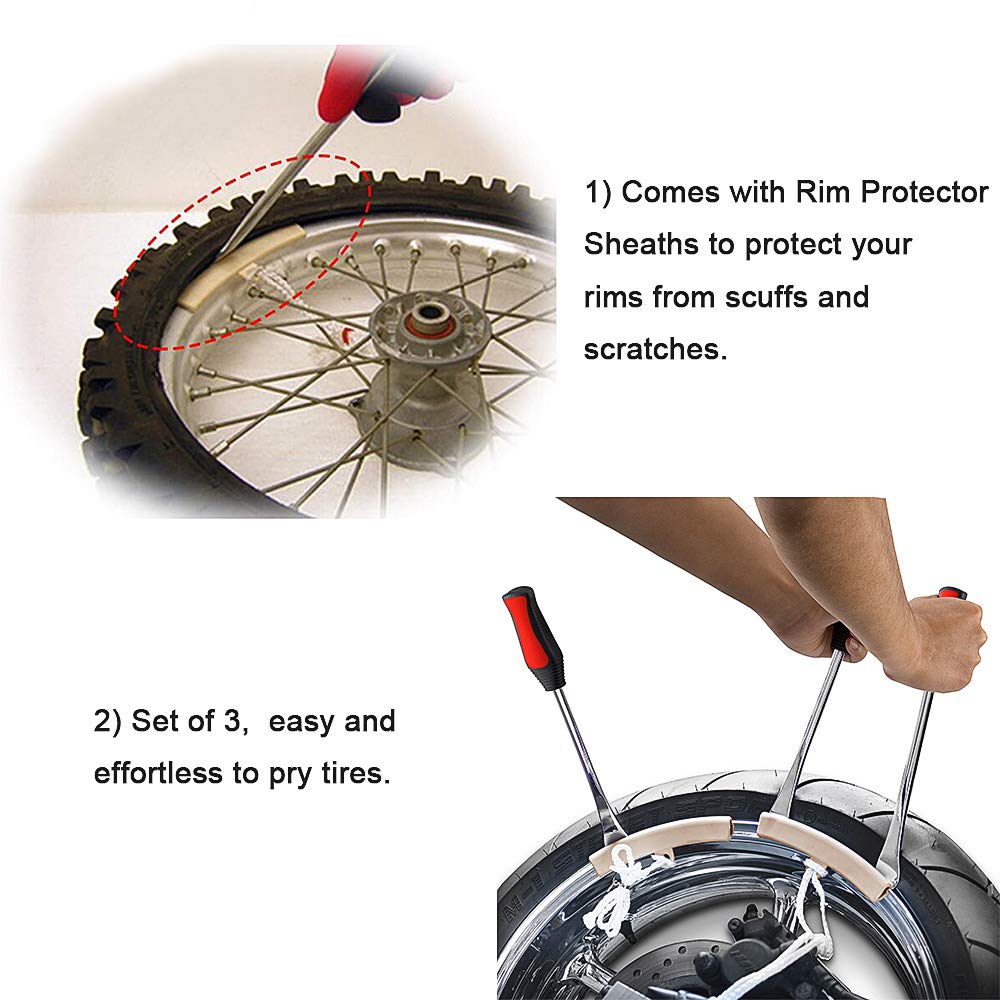 【GUARANTEE】100% satisfaction guarantee. All ASOOLL tools come with 3 years warranty, If you encounter any quality problems in use, please feel free to contact us, we will handle it within 24 hours. Please buy with confidence. | 【PREMIUM QUALITY-TIRE LEVERS】These tire spoons are made from hardened rust-resistant steel with polished chrome finish,tough and durable.Ergonomic grooved handle provides comfort and security,which makes it less likely to slip out of your hands when putting a new tire and tube on with lubricant or soap. | 【USER FRIENDLY】Set of 3, 11.5” red tire spoons are not only easy and effortless to pry tires,but also strong enough to pull the tire bead over the rim without bending them or breaking off. | 【RIM GUARDS INCLUDED】Comes with Rim Protector Sheaths to protect your rims from scuffs and scratches. Our rim guards are durable, strong and not easily damaged.it have ropes which can pull them back out if they fall inside the tire. | 【APPLICATION】Perfect for motorcycle,wheelchair ,bike,Scooter and other small size tire changes.it doesn’t fit for car tires.
