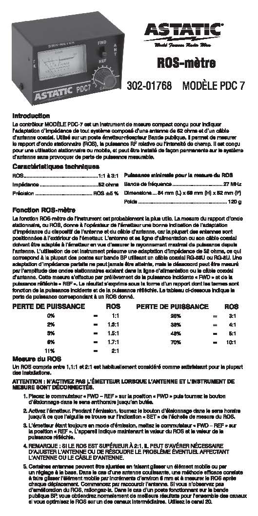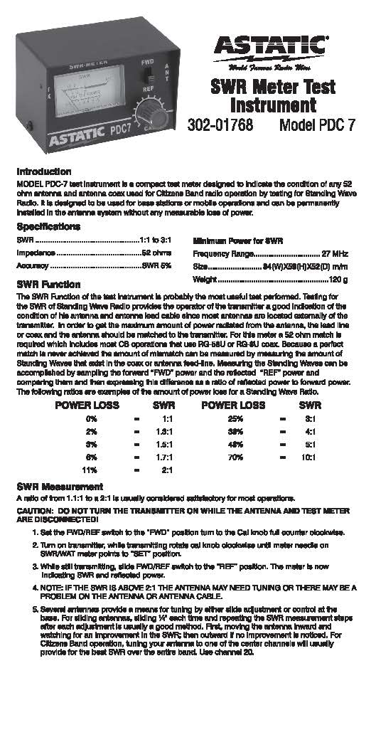 Q: What is the purpose of the Astatic 302-01768 PDC7 Compact SWR Meter?A: The Astatic 302-01768 PDC7 Compact SWR Meter is designed to help you measure the Standing Wave Ratio (SWR) of any 50 ohm antenna and coax, ensuring optimal performance of your radio setup.
