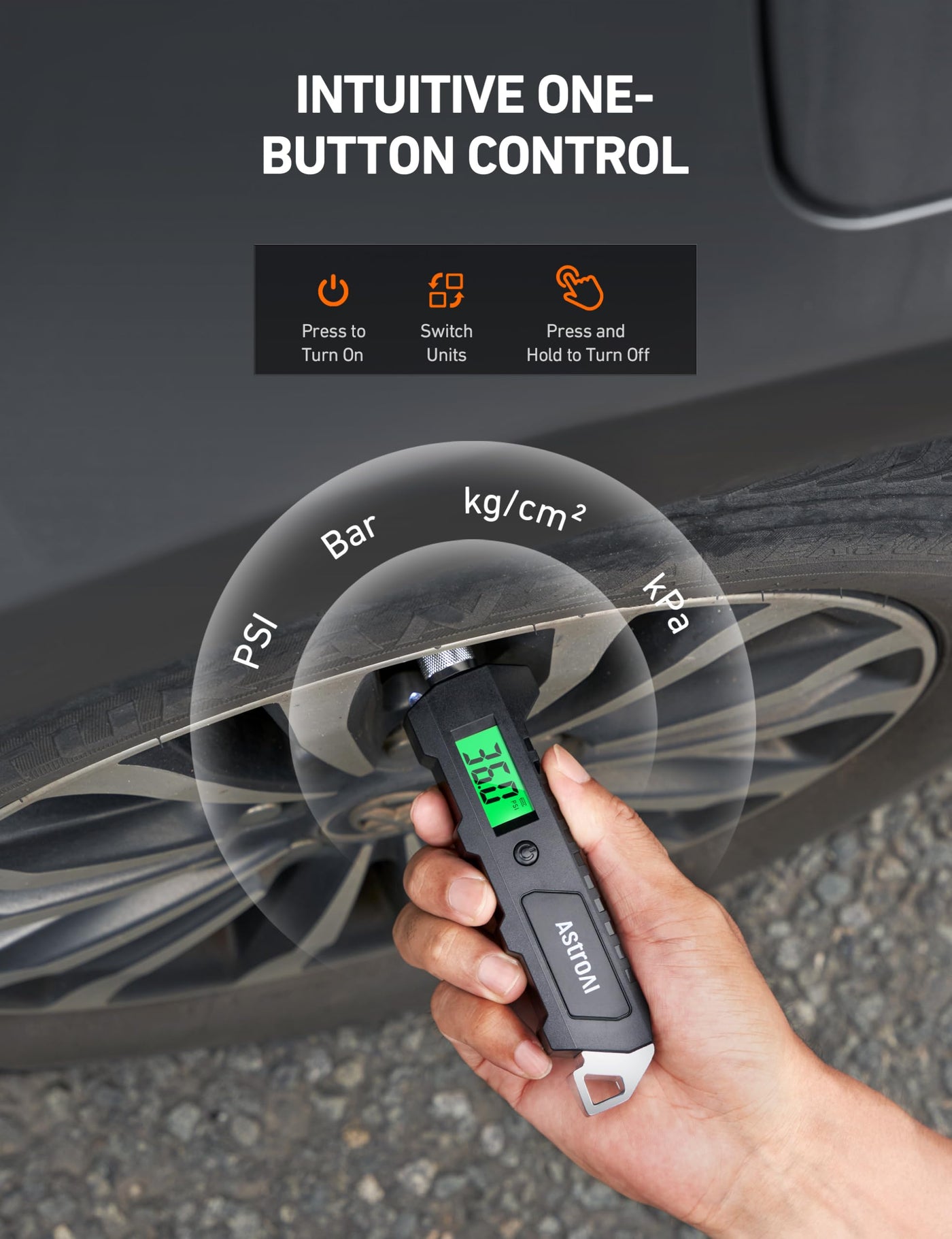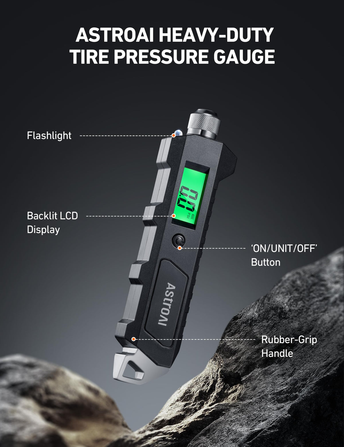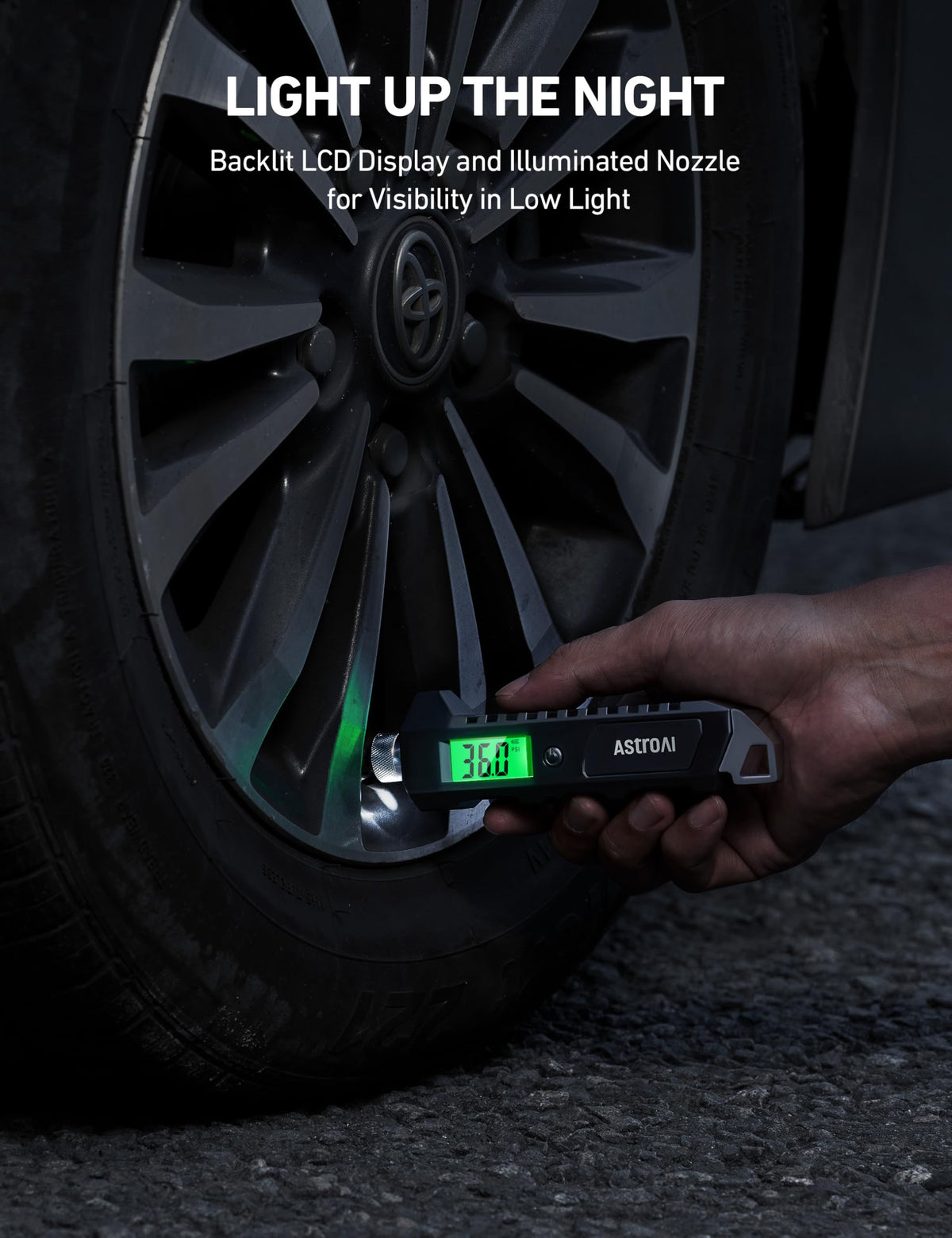 Q: What are the features of the AstroAI Digital Tire Pressure Gauge?A: The gauge features a green backlit LCD display for visibility in low-light conditions, easy-to-read digits, four measurement settings, and a non-slip grip for easy handling.