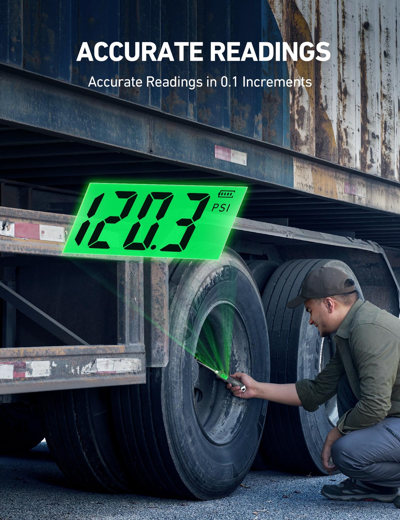 Q: How does the backlit LCD display work in low light conditions?A: The gauge features a green backlit LCD display that ensures clear visibility in dimly lit areas, allowing for easy reading of tire pressure even at night or in dark garages.