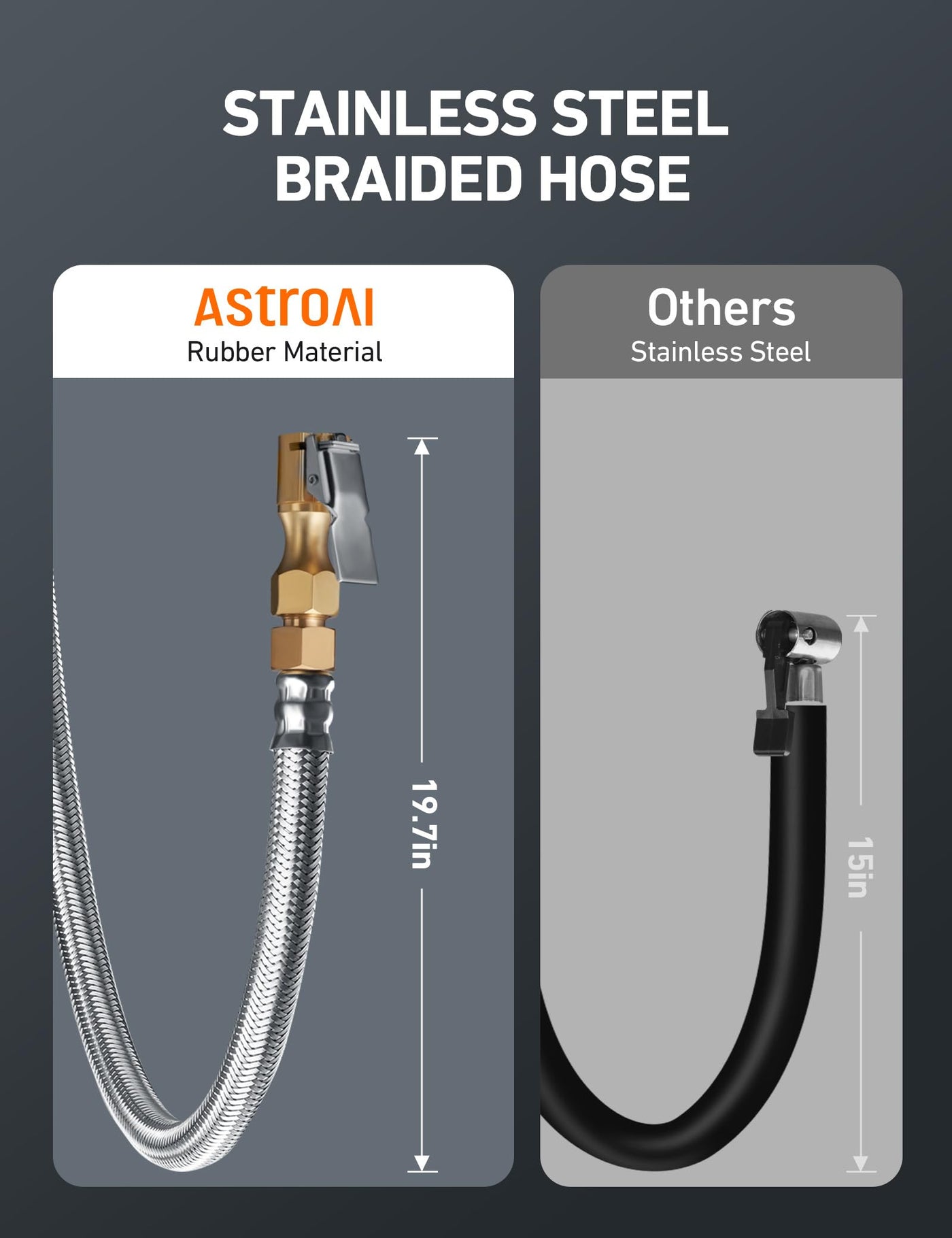 Perfect Inflation The Every Time The Astroai Digital Tire Inflator Gauge Simplifies The Process Of Inflating Tires With An Air Compressor. Theres No Pumping, Pressure Checking, Adjusting And Repeating, Just Inflate The Tire To Your Preferred Pressure. The Astroai Digital Tire Inflator Gauge Allows You Faster Inflation With Fewer Instruments, Enabling You To Get It Right Every Time. High-Quality Construction&Nbsp; The Gauges Weight Is Instantly Noticeable As Only High-Quality Stainless Steel And Brass Are Used. This Creates An Extremely Heavy-Duty Inflator Gauge That Can Withstand Up To An Incredible 250 Psi. The 22'' Stainless Braided Hose Is Strong And Flexible And Protects The Internal Hose From Damage Allowing The Tool To Endure High Pressures.&Nbsp; Specifications Inflation Range: 0-250 Psi, 0-17.2 Bar, 0-1720Kpa, 0-17.5 Kgf/Cm2 Accuracy: 1% Display Resolution: 0.1 Psi Display Type: White Backlit Lcd Measurement Units: Psi, Kpa, Bar, Kgf/Cm2 Compatibility: Npt Air Compressor Connector Battery Type: 2*Aaa Batteries Package Contents 1 X Astroai Tire Inflator Gauge 250 Psi 1 X Valve Core Tool 1 X Presta Valve Adapter 4 X Valve Caps 1 X Motorcycle Right Angle Adapter 1 X Brass Twist-On Air Chuck 1 X Thread Seal Tape Roll 1 X Interchangeable Lock-On Brass Chuck 2 X Aaa Batteries 1 X Npt Quick-Connect Fitting 1 X Inflation Needle 2 X Cone Inflation Adapters 1 X User Manual&Nbsp;