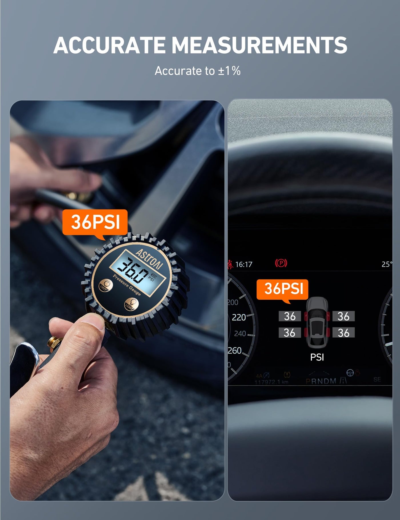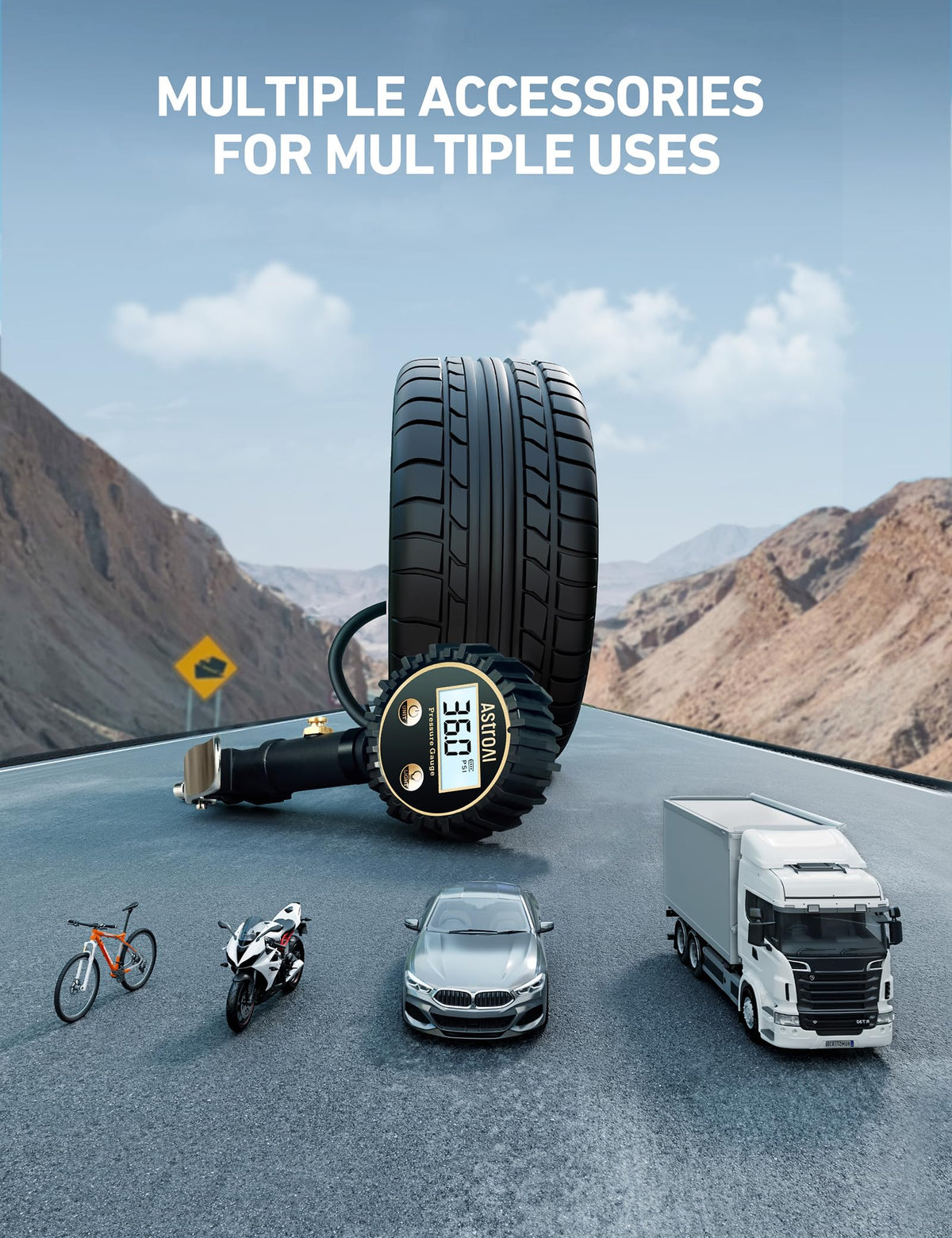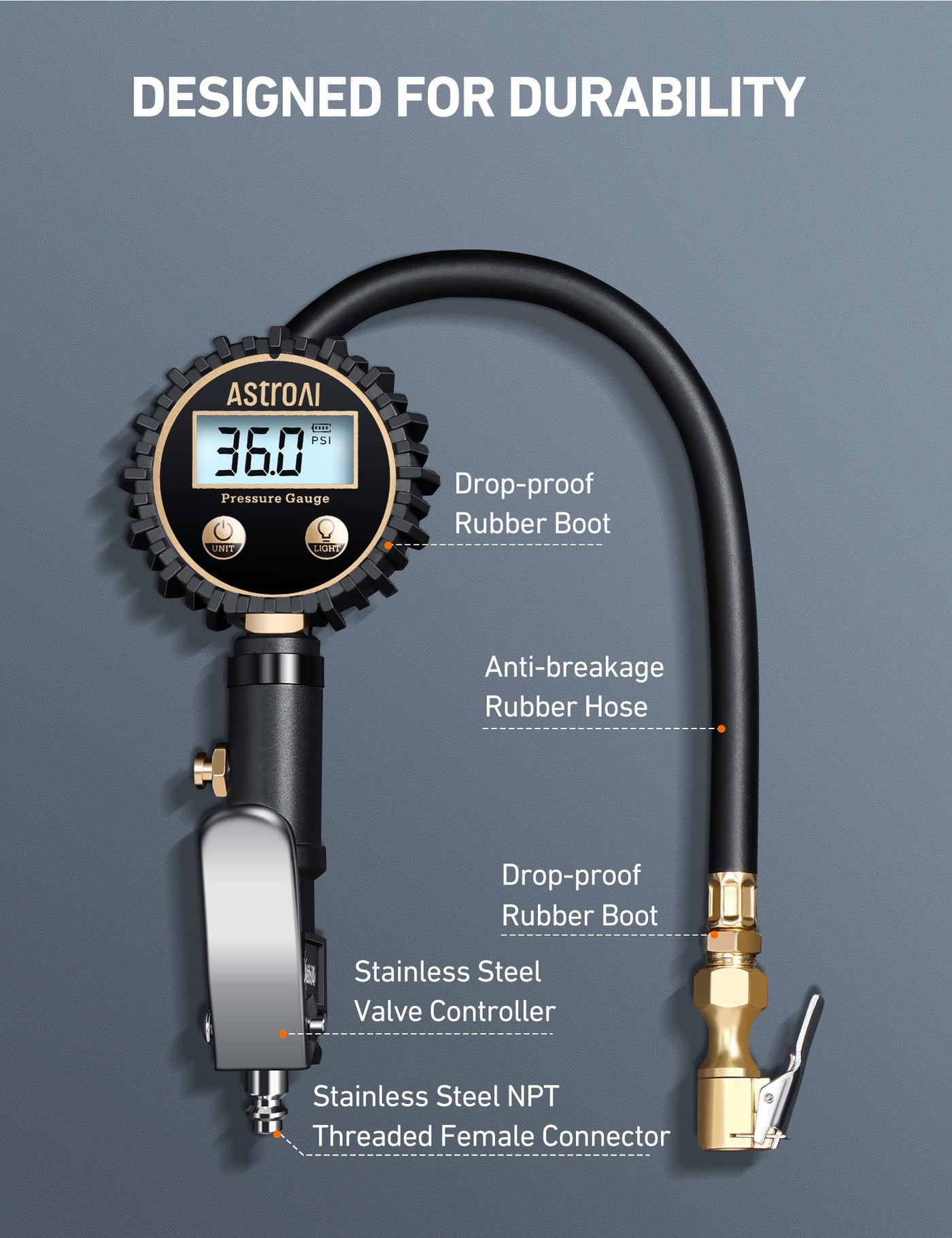 ADVANCED ACCURACY: Professionally calibrated to always return an accurate reading within 1% of the exact pressure of your tire. Accurately measures FOUR DIFFERENT UNITS in a range from 3-250 PSI (0.2-17.2 Bar; 0.21-1724 Kpa; 0.2-17.5 kg/cm^2). Stocking Stuffers for Men | ALL-IN-ONE FEATURES: The LED backlit screen features measurements in PSI, KPA, Bar, and Kg/cm^2; Includes an inflator, straight locking chuck, gauge, hose, bleed valve, all in one unit, ideal for cars, bicycles, motorcycles, balloons, air cushion, sports balls and so on; Compatible with ¼” NPT air compressors output | INCREASED SAFETY: Properly inflated tires provide better performance in all weather conditions, decreasing the likelihood of flats, explosions, and crashes; Increase your MPG and save money on fuel costs and tire wear | SUPERIOR CONSTRUCTION: Built of high quality, heavy duty stainless steel and brass components that provide lasting performance; Use for all vehicles, such as Cars, SUVs, Trucks, Motorcycles, Bicycles (with Schrader valve), RVs, and more! | SAVES BATTERY LIFE AND MORE: Automatically turns on and will also turn off after 20 seconds of inactivity to preserve battery life; built-in air bleeder valve to quickly decrease pressure in overinflated tires