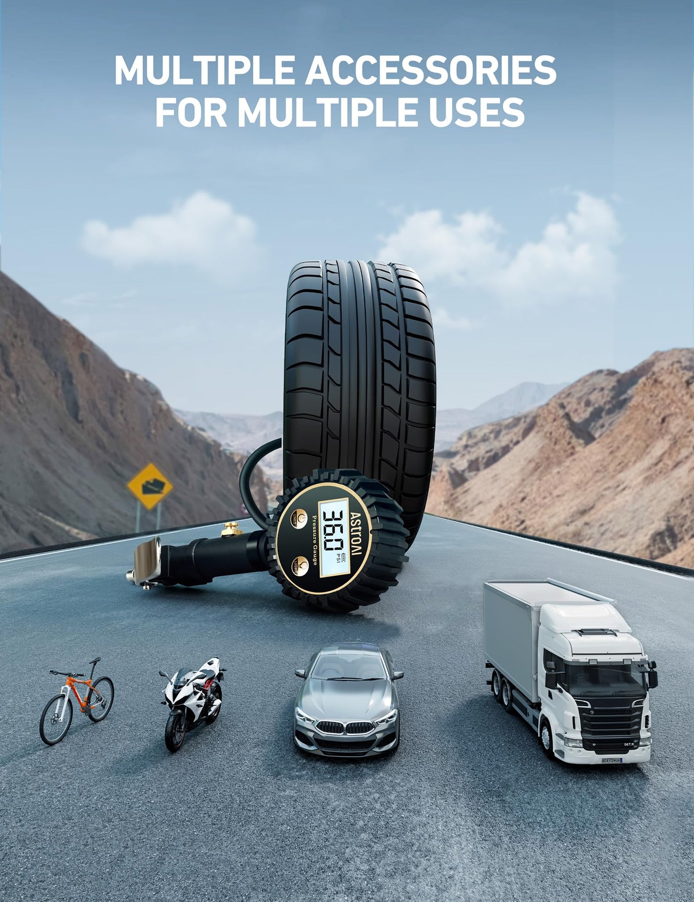 AstroAI Digital Tire Pressure Gauge with Inflator(3-250 PSI 0.1 for Display Resolution), Heavy Duty Air Chuck and Compressor Accessories with Rubber Hose and Quick Connect Coupler, White