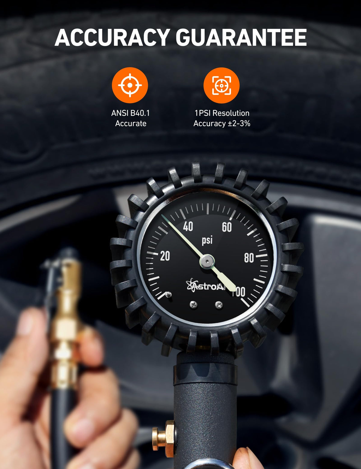 Fill it Right the First TimeThe AstroAI 100 PSI Tire Inflator Gauge makes filling tires extremely easy when using an air compressor. Instead of filling a tire, check the pressure, adjusting, checking, and repeating over and over again, simply fill the tire to the exact pressure you want. Fill a tire to specification twice as quickly or even faster by using fewer instruments! Save time and just fill it right the first time.High Quality ConstructionThe first thing you'll notice about this gauge is its weight; only high quality stainless steel and brass was used to provide an extremely heavy duty inflator gauge that can easily handle up to 100 PSI. The rubber hose is insulated and extra thick for superior performance.SpecificationsInflation Range: 0-100 PSIAccuracy: 2-3% Grade B40.1 International Accuracy StandardDial Type: AnalogueMeasurement Units: PSICompatibility: NPT air compressor connectorPackage Contents1 x AstroAI Tire Inflator Gauge1 x User Manual1 x NPT Steel Fitting4 x Valve Caps1 x Brass Air Chuck1 x Thread Seal Tape Roll