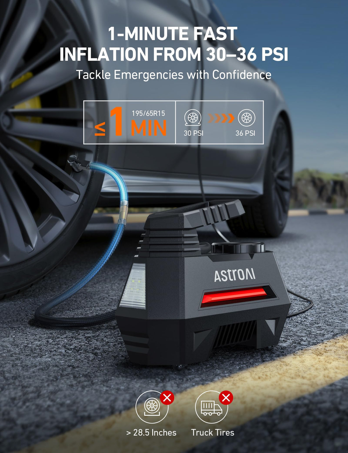Inflate On The Go The Astroai 100Psi Portable Air Compressor Quickly Inflates Your Caras Tires When Youare On The Go Whether Youare At Home Or On The Road, Checking And Adjusting Tire Pressure Are Done Quickly Just Set Your Caras Recommended Tire Pressure Into The Programmable Lcd Screen And This Little Pump Brings Tires Up To Their Correct Pressure In A Flash Save Money And Drive Safer Properly Inflated Tires Are The Most Important Aspect To Safe Driving Tires That Are Under Or Over Inflated Create Hazards For Drivers And Passengers Regularly Checking Your Vehicleas Tire Pressure Not Only Increases The Safety Of Your Vehicle, But Keeps It Running Optimally Properly Inflated Tires Wear Out Slower And Lengthen The Lifespan Of Suspension Components, Saving You A Lot Of Money And Headache Specifications Input Voltage: 12V Dc Wire Length:3 Meters Rated Power: 120W Ax Pressure Reading:100 Psi Continuous Operating Time:15 Minute Maximum