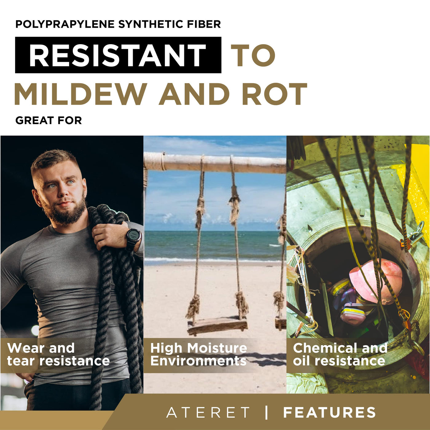 Q: What are the main advantages of using ATERET Twisted ProManila over traditional manila rope?A: ATERET Twisted ProManila is made from durable polypropylene, making it twice as strong as traditional manila rope. It is lightweight, rot-proof, and resistant to water, oil, gasoline, and most chemicals, making it ideal for various indoor and outdoor applications.