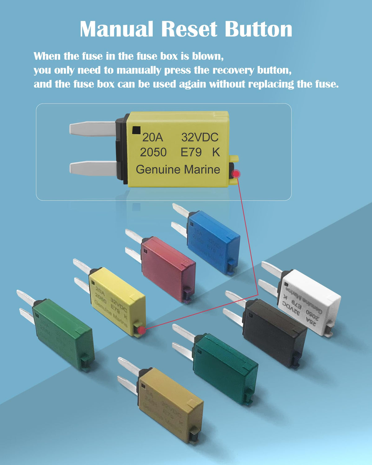 Q: How do I reset the manual reset fuses after they blow?A: To reset the manual reset fuses, simply press the reset switch on the fuse blade after it has blown. This feature allows you to quickly restore functionality without needing to replace the fuse, making it ideal for troubleshooting.