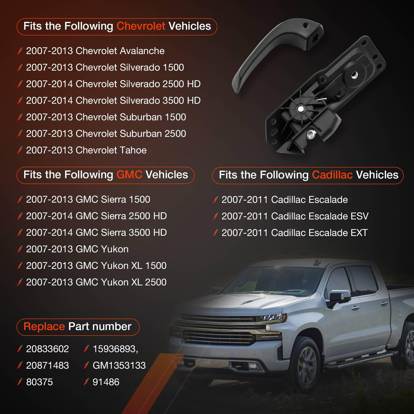 Q: What vehicles are compatible with the ATRACYPART Interior Door Handle Kit?A: The ATRACYPART Interior Door Handle Kit is compatible with a range of vehicles including the 2007-2013 Chevrolet Avalanche, Silverado 1500, Silverado 2500 HD, Silverado 3500 HD, Suburban 1500 and 2500, Tahoe, as well as the 2007-2013 GMC Sierra 1500, Sierra 2500 HD, Sierra 3500 HD, Yukon, and Yukon XL models. Additionally, it fits the 2007-2011 Cadillac Escalade and its ESV and EXT versions.