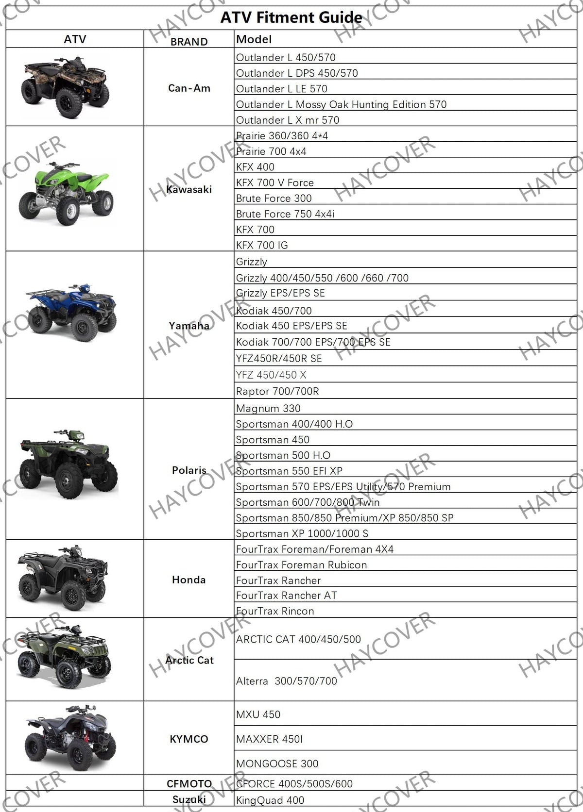 Q: Is this ATV cover compatible with multiple brands?A: Yes, this ATV cover is designed to fit a variety of brands including Polaris, Honda, Can-Am, Kawasaki, Yamaha, and Arctic Cat. Always check the fitment guidelines or contact us if you have any doubts about compatibility.