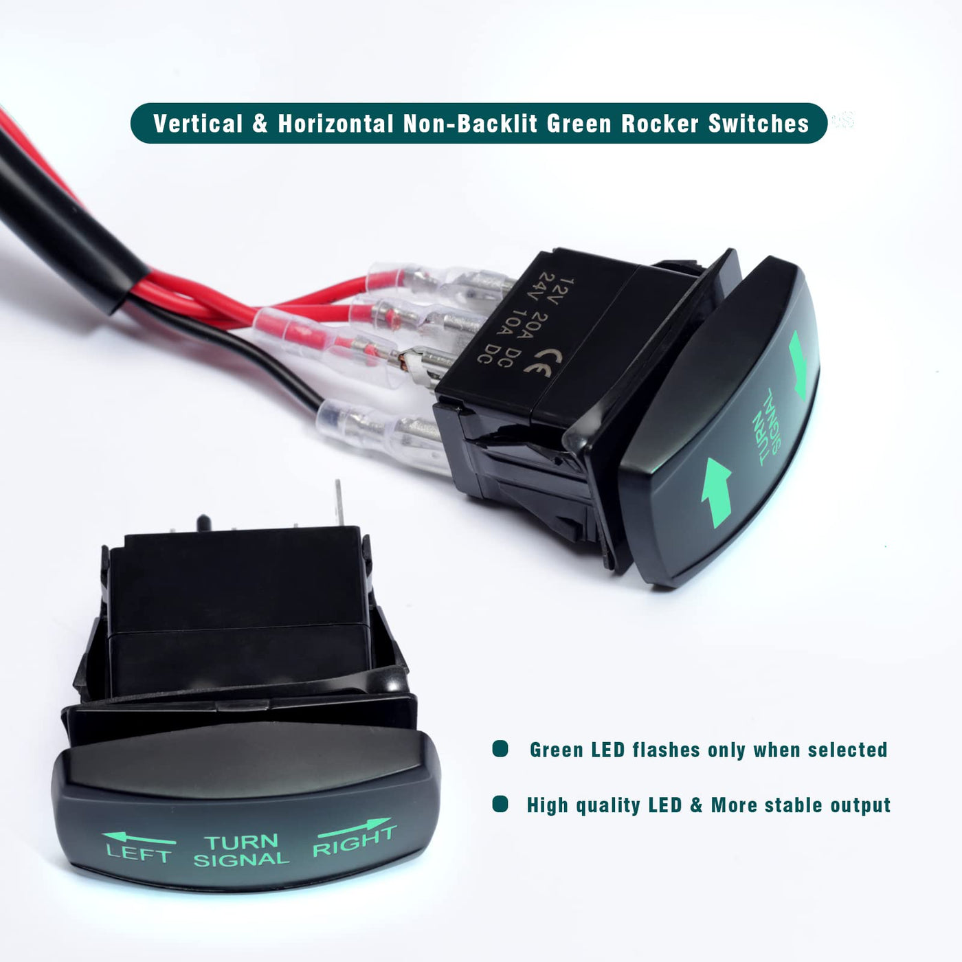Product Specifications: Product Type: Universal ATV UTV rocker switch turn signals street legal kit Voltage: 12V 40A Light Color: Green 10-Round Led Signals: Mount into 3/4'' hole Material: High-performance fully corrosion and dust resistant materials Condition: 100% Brand New LED Turn Signal Light Color: Amber / Red Package Includes: 5x Amber Turn Signal LEDs 5x Red Turn Signal LEDs 2x Turn signal rocker switches 1x 12V 40A Flash Relay 2x Red/Black Bonded Harness 2x Spare wiring Compatible Models: Compatible with Polaris RZR Compatible with Polaris Ranger Compatible with Yamaha Rhino Compatible with Yamaha Viking Compatible with Kawasaki Teryx Compatible with Can Am Commander Compatible with Arctic Cat Wild Cat Product Features: 1. You can make your off-road vehicle legally on the road (please refer to local laws for details). 2. Compatible with most UTVs and other vehicles. 3. Plug and play, you can complete the installation by yourself. 4. It can be used even in bad weather, the led amber light is very penetrating. 5. Backlit switch with indicators light that flashes when selected. 6. A significant tool to predict vehicle dynamics. High Quality Material: Durable and reliable in extreme conditions Wear-resistant Corrosion-resistant Water-resistant Warm Tips: Please wear gloves to prevent scratching your hands during the repair work. Our products have been undergone durability test, sealing test, temperature test, and pressure tests before packing and shipping. Meet or exceed OE standard quality and performance requirements