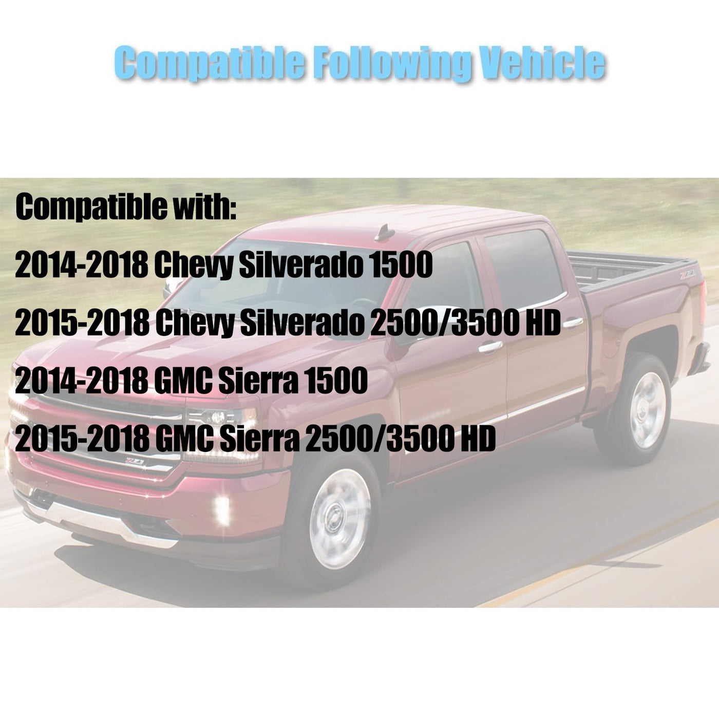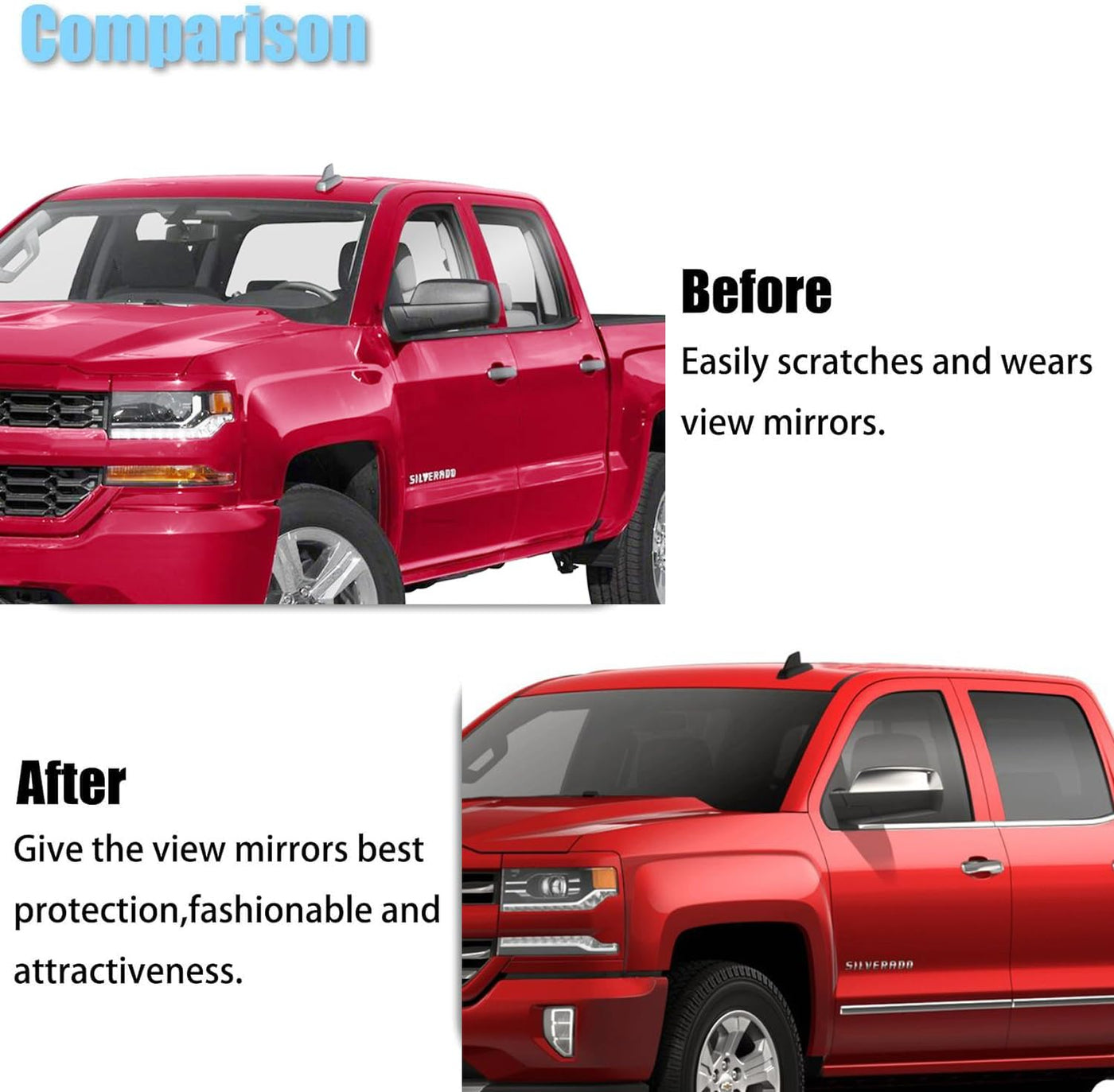 PACKAGE INCLUDE: 2 Top Half Mirror Covers REPLACEMENT FOR: Fit 2014-2018 for Chevy Silverado 1500 Fit 2015-2019 for Chevy Silverado 2500/3500HD Fit 2014-2018 for GMC Sierra 1500 Fit 2015-2019 for GMC Sierra 2500/3500HD NOTE: The top half mirror covers are not to replace the original rear view mirror, this is just a set of protective cover, please pay attention to when buying If you are in the cold winter installation, please be sure to paste firmly before using your car, because of the weather, may let the double-sided adhesive decline.It's not a quality issue