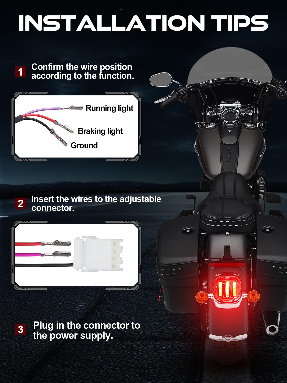 Q: How do I install the AUDEXEN LED Tail Light?A: Installation is straightforward with a plug-and-play design. The wire connections include black for ground, purple for the running light, and red/yellow for the brake light. Simply connect the wires according to the provided diagram.