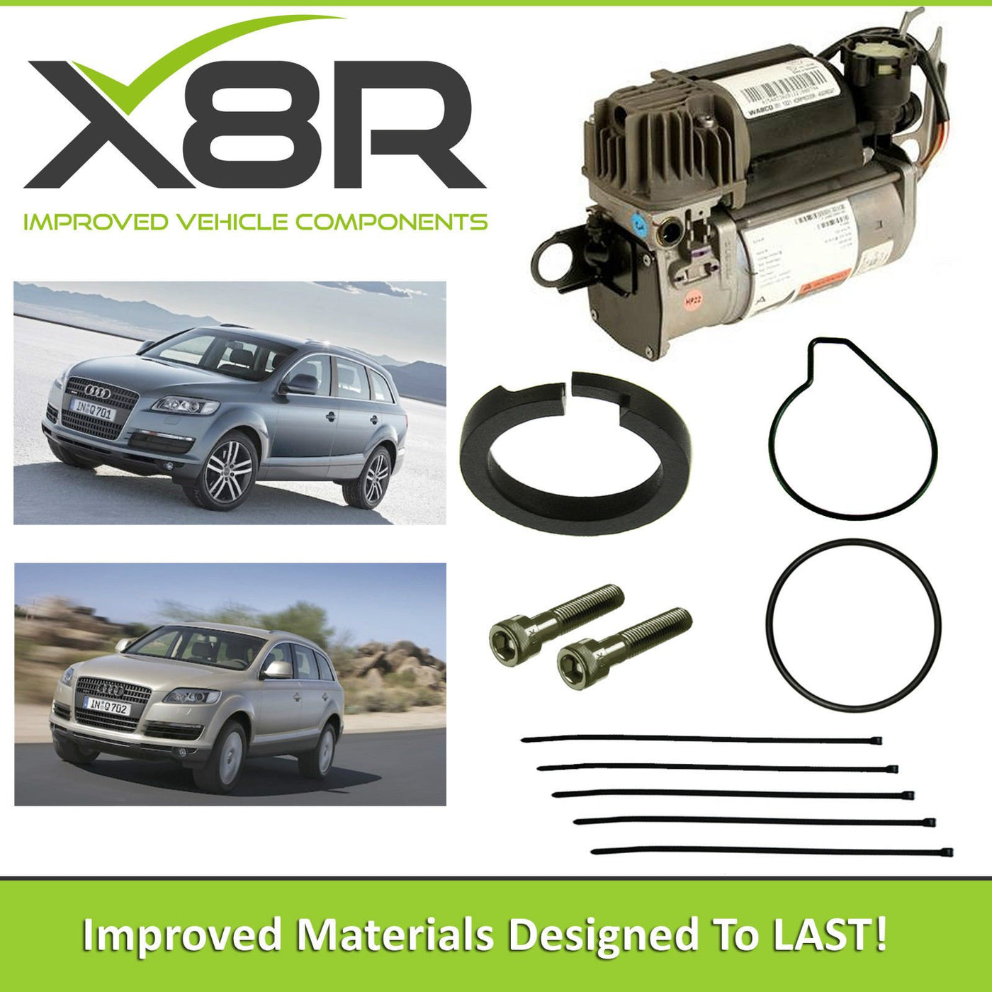 Audi Q7 2005-2013 WABCO AIR SUSPENSION COMPRESSOR PISTON RING REPAIR FIX KIT --||-- VEHICLES AFFECTED Audi Q7 2005-2013 Associated part numbers, our kit will only repair Wabco compressors. Official Compressor: 4L0 698 007 A/B/C, 7L0 698 853 A, 7L8 616 006 A/C, 7L8 616 007 A/C/E/F Wabco: 415 403 305 0, 415 403 123 0 Noisy suspension? Is your vehicles air suspension rising slowly or perhaps failing to rise at all? Vehicle stuck at Level 1. Failing to progress through Levels 2,3,4. Suspension error light showing. Yellow suspension error light lit? --||-- THE CAUSE The piston ring within your vehicles EAS air compressor is worn reducing output significantly. The poor quality piston ring within your air suspensions compressor wears over time causing these symptoms. The piston ring within the compressor unit of your air suspension system deteriorates over time, the OEM piston ring is made from a soft plastic that wears quickly, this wear substantially reduces the output of your compressor leading to noisy, slow rising or non-rising suspension. --||-- THE SOLUTION Fit our improved design PTFE piston ring and restore your compressor to full health! Simply install our replacement PTFE piston ring and restore your compressor, full instructions are included to guide you through this simple process which should take under 30 minutes. Our item is made from PTFE which has far superior wear resistance compared to the OEM part providing a permanent fix to the problems with your compressor.****** INSTRUCTIONS: 1. http://x8r-instructions.co.uk/Wabco-Air-Suspension-Compressor-Piston-Ring-Seal-R.pdf **** 2. https://www.youtube.com/embed/_BwGaP4Zaqc?rel=0