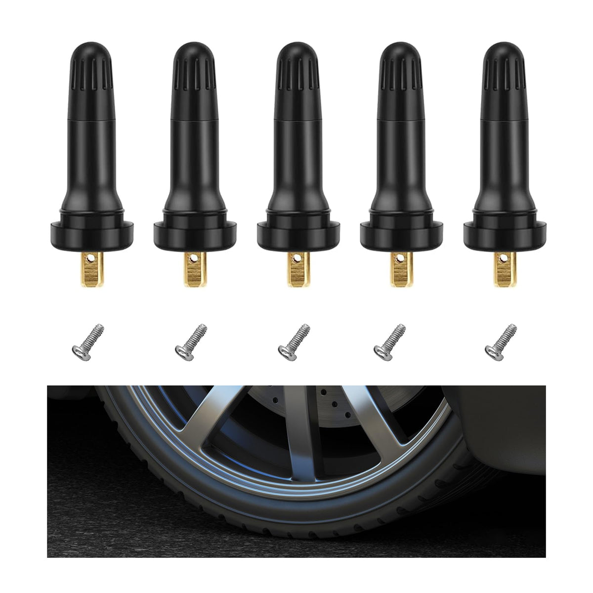 Q: What materials are used in the Augeny 5PCS TPMS tire valve stems?A: The Augeny tire valve stems are made from high-quality EPDM rubber combined with copper for durability. The valve's exterior is nickel plated, which helps prevent rust and oxidation.