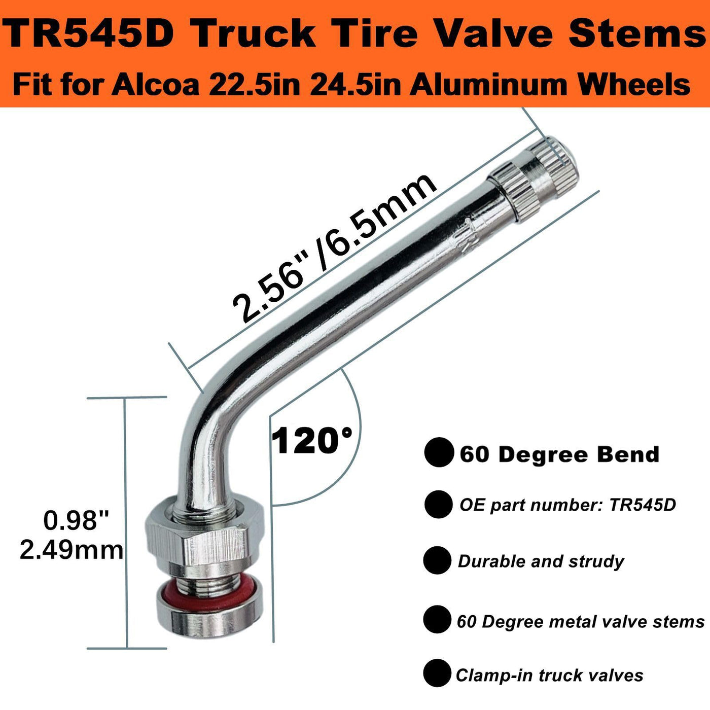Truck Tire Valve Stems, TR545D Valve Stem Extension Adaptor Compatible with Alcoa 22.5in 24.5in Aluminum Wheels 9.7mm Rim Hole (Pack of 10), Clamp-in Brass Valve Stem for Truck and Bus with 60 Bend Package Include:1Pcs metal valve core remover,10Pcs brass valve core remover caps,10Pcs Truck TR545D 60 Degree Valve Stems,Compatible with Alcoa 22.5in 24.5in Aluminum Wheels providing ample quantity for various applications. These TR545D 60 Degree Bend Clamp-in Valve Stems are designed to fit most trucks and trailers with 22.5in to 24.5in aluminum wheels. Our Valve stems made of high-quality brass and feature a compact design with an Alcoa aluminum wheel. The stems are easy to install and provide a secure hold on the valve. They are also rated for up to 200 PSI, making them ideal for use with heavy-duty tires. With a pack of 10, you have enough stems for all your tires and can easily replace them when needed. Specification: Item Type: Valve Stem,truck valve stem,tire rim,tubeless valve stem Material: Brass OE: TR545D Fit Rim Hole : 0.382'' - 0.394'' (9.7 - 10 mm) Outer Diameter of Bottom: Approx. 16mm/0.63in Total Length: Approx. 90mm/3.54in Standard: 60 degrees bending Fitment: Fit for Alcoa 22.5in and 24.5in Aluminum Wheels