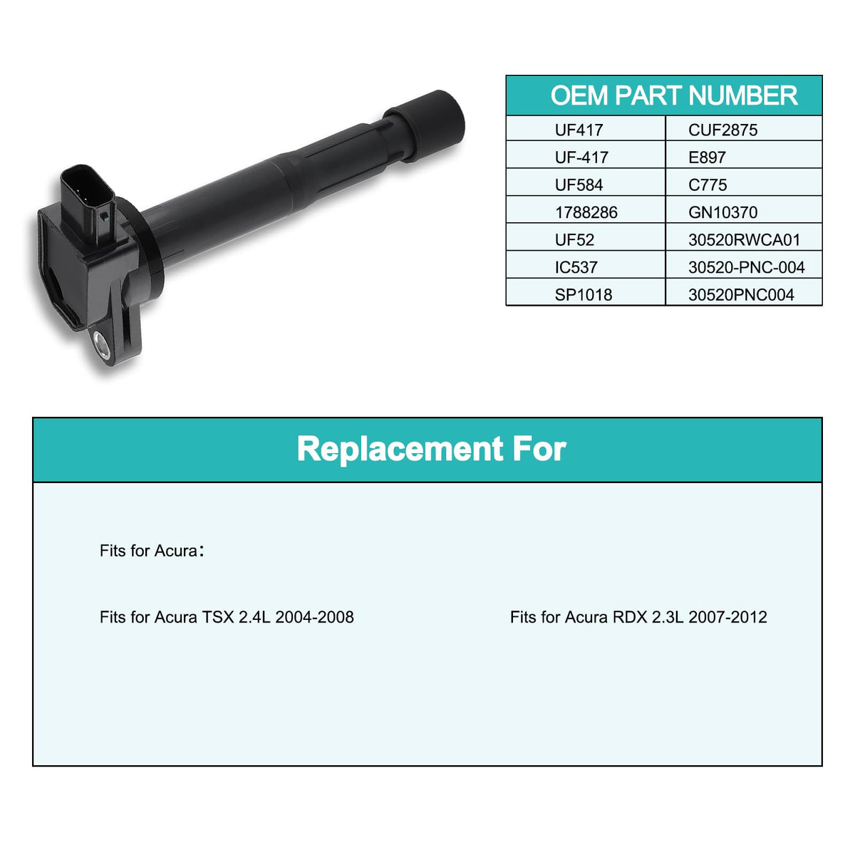 Q: What vehicles are compatible with the AULINK 4PCS UF417 Ignition Coil Pack?A: The AULINK 4PCS UF417 Ignition Coil Pack is compatible with Acura TSX 2.4L models from 2004 to 2008 and RDX 2.3L models from 2007 to 2012.