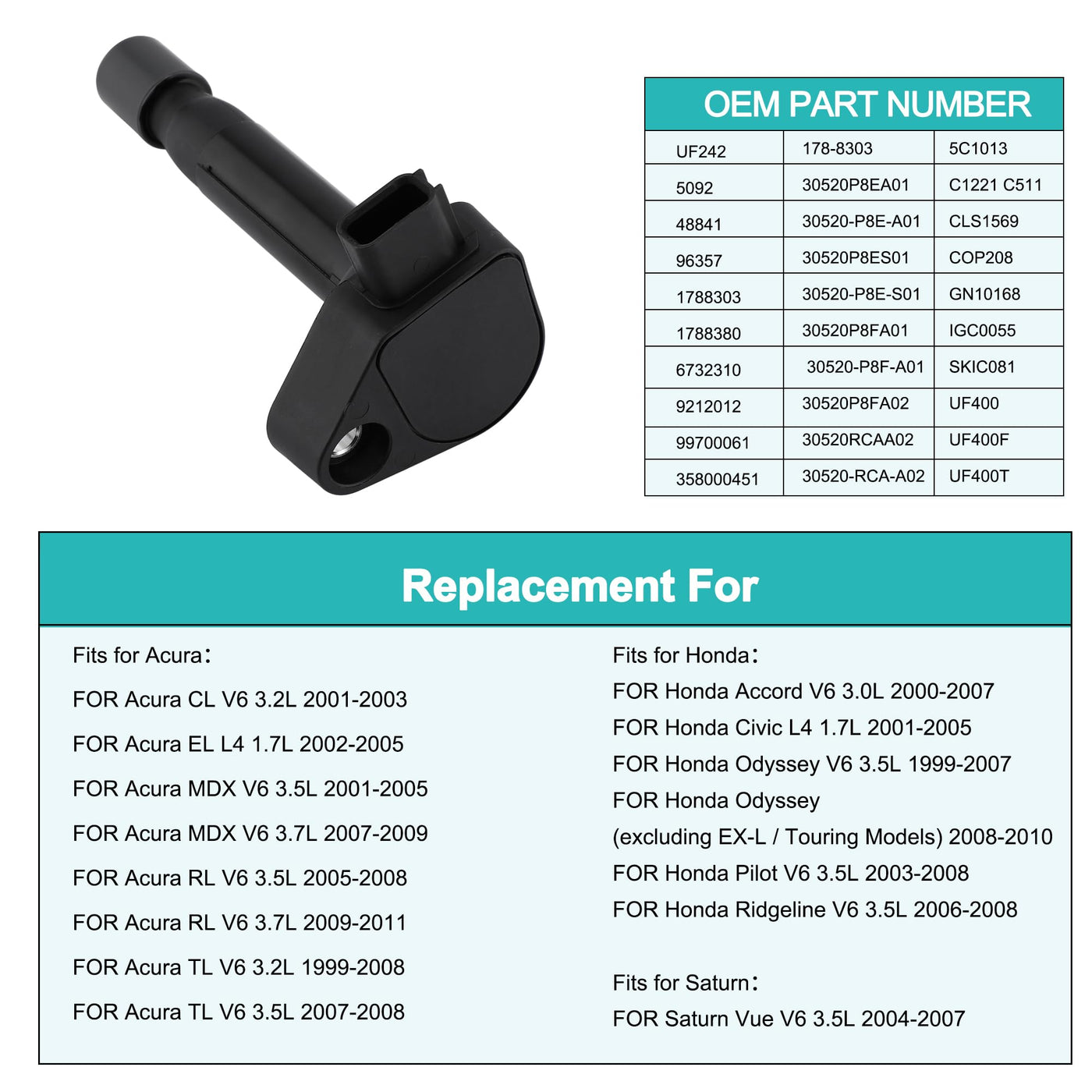 Q: What vehicles are compatible with the AULINK 6PCS UF242 Ignition Coil Pack?A: The AULINK 6PCS UF242 Ignition Coil Pack is compatible with various Honda and Acura models, including Acura CL (2001-2003), MDX (2001-2009), RL (2001-2011), TL (1999-2008), as well as Honda Accord (2000-2007), Odyssey (1999-2010), Pilot (2003-2008), and Ridgeline (2006-2008). Additionally, it is suitable for Saturn Vue (2004-2007).