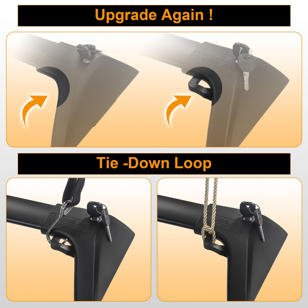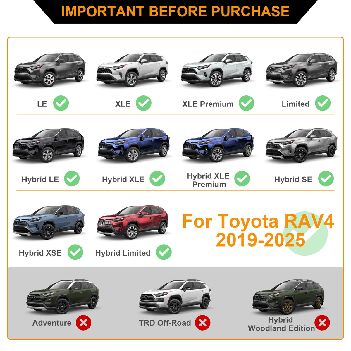 Special designed to Compatible for Toyota RAV4 2019-2025 LE/LE Hybrid/XLE/XLE Premium/XLE Hybrid /Limited/Limited Hybird/XSE Hybrid . (Not Fit 2024 LE/ Adventure/TRD Off-Road/Hybrid Woodland Edition) Made of upgraded 2 mm thickness aluminum alloy . Black Matted powder coated on the bar. 100% anti-corrosion, light weight & Durable This cross bar is ideal for compatible for bike mounts ,cargo carrier ,snowboards ,roof box. kayak mounts And more . Reminder: Noted that FORWARD ARROW mark on the end cap cover is point to the front of vehicle. This pair crossbars has 1 longer one + shorter one . the longer one should mount on the front of vehicle Caution: When installing large volume of cargos such as kayak. do not driving at high speed due to the wind -resistance increase a lot ,it will leads to exceed the Bars Max loading capacity Specifications : Quantity: 1 pair cross bar Length: 46 inch Height: 4.7inch Width: 8.7 inch Load Weight: 260 LB Color: Black Matte Material: Aluminum alloy + ABS Plastic Package Included: -1 Pair Aluminum Bars -needful hardware -2x Allen driver -2x Key -4 x Aluminum Mounting Holders -4 x End caps -1 x Instruction Manual