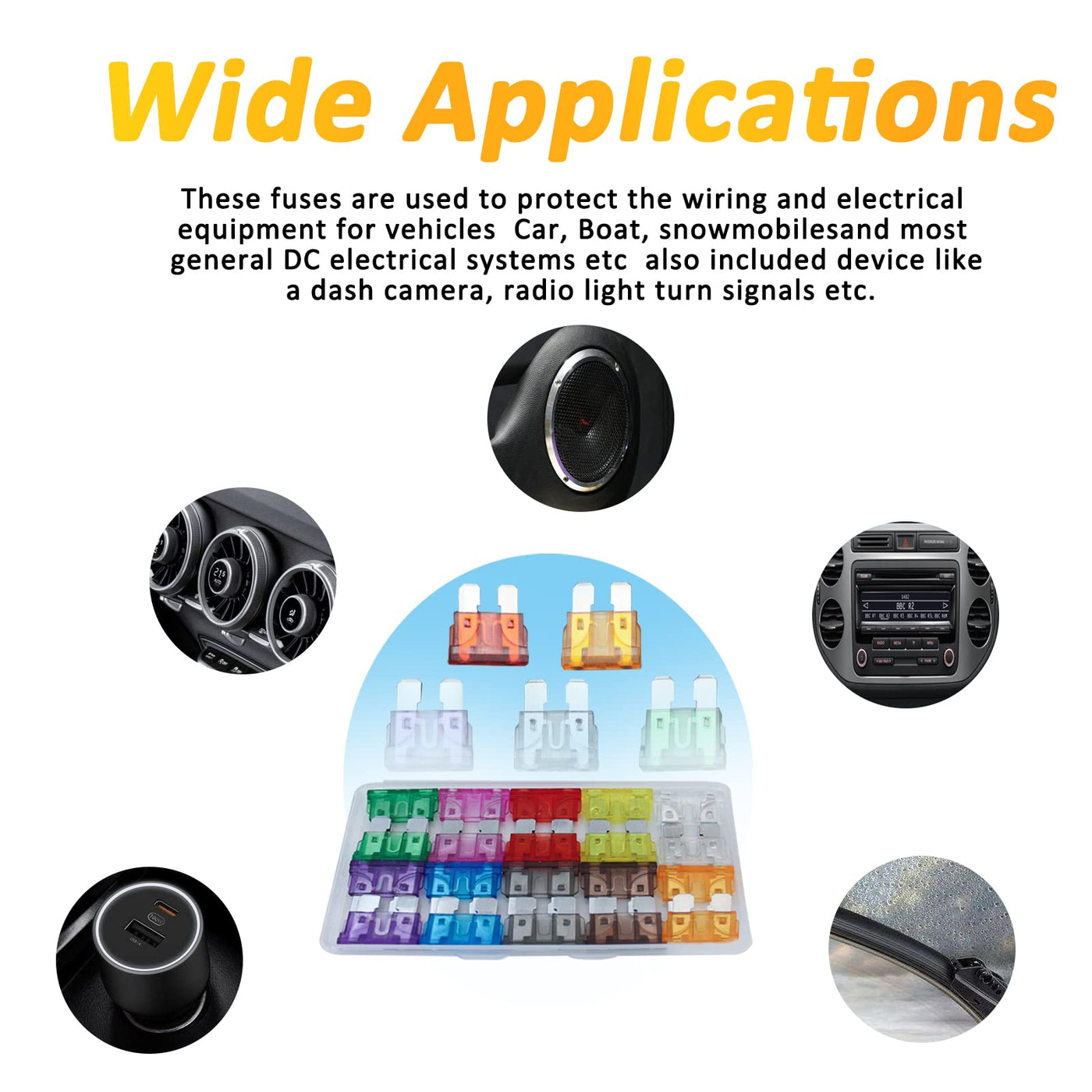 Q: What types of vehicles are compatible with the Auto Car Standard Blade Fuses Assortment Kit?A: The Auto Car Standard Blade Fuses Assortment Kit is designed for a wide range of vehicles, including cars, trucks, SUVs, boats, RVs, motorcycles, and other general DC electrical devices. It is ideal for replacing blown fuses in various automotive applications.