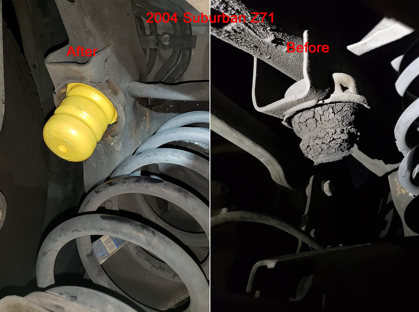 According to the Vehicle Catalog, these rear axle bumpers fits(2021/04/07 edited): TAHOE 2000-2006 AVALANCHE 1500/2500 2002-2003 SUBURBAN 1500/2500 2000-2003Easy Installation: 1.Just pulled out the remaining debris, cleaned out the retaining cups 2.Pushed one side of it into place.then use closed end small wrench to push the rest into the tabs 3.They snap into the cup with no other fastening device and a good tight fit is essential
