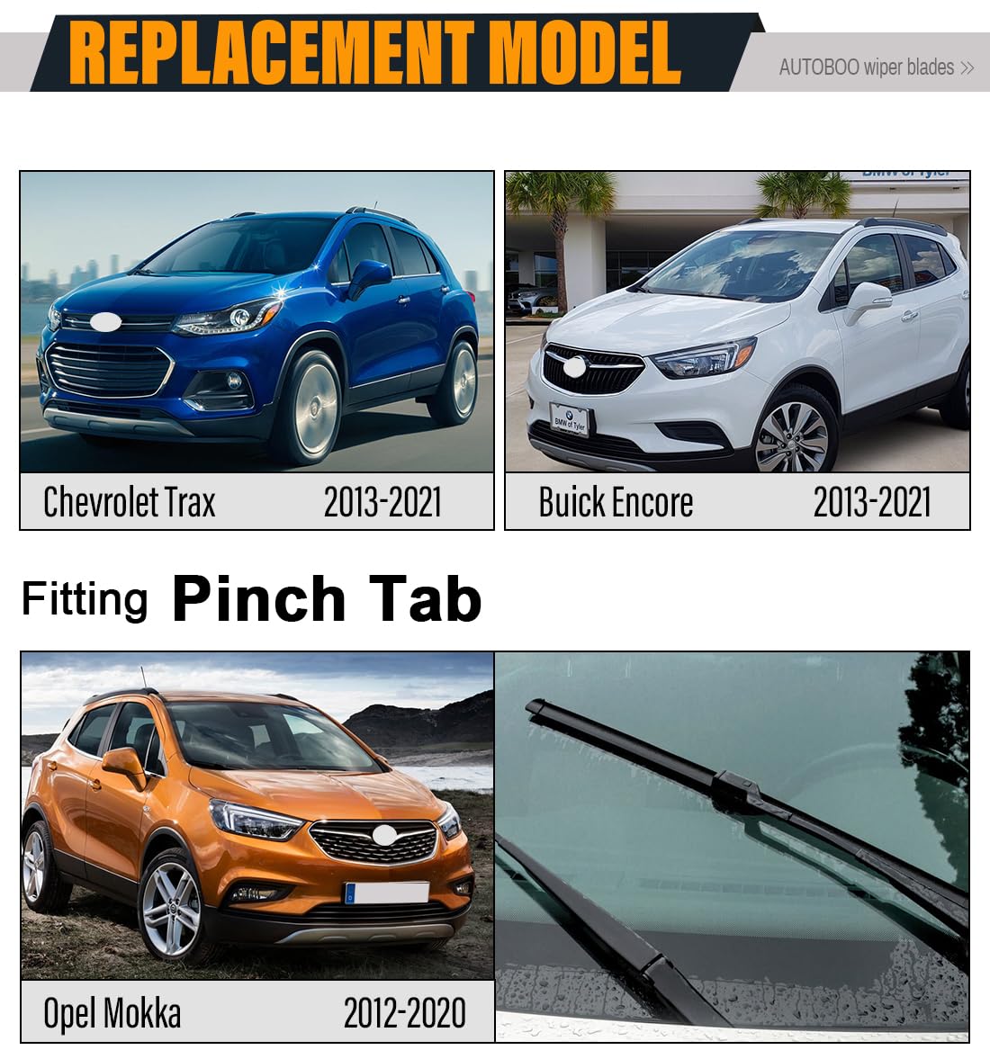 Q: What vehicles are compatible with the AUTOBOO windshield wipers?A: The AUTOBOO windshield wipers are specifically designed to fit Chevrolet Trax models from 2013 to 2023, Buick Encore models from 2013 to 2022, and Opel Mokka models from 2012 to 2020.