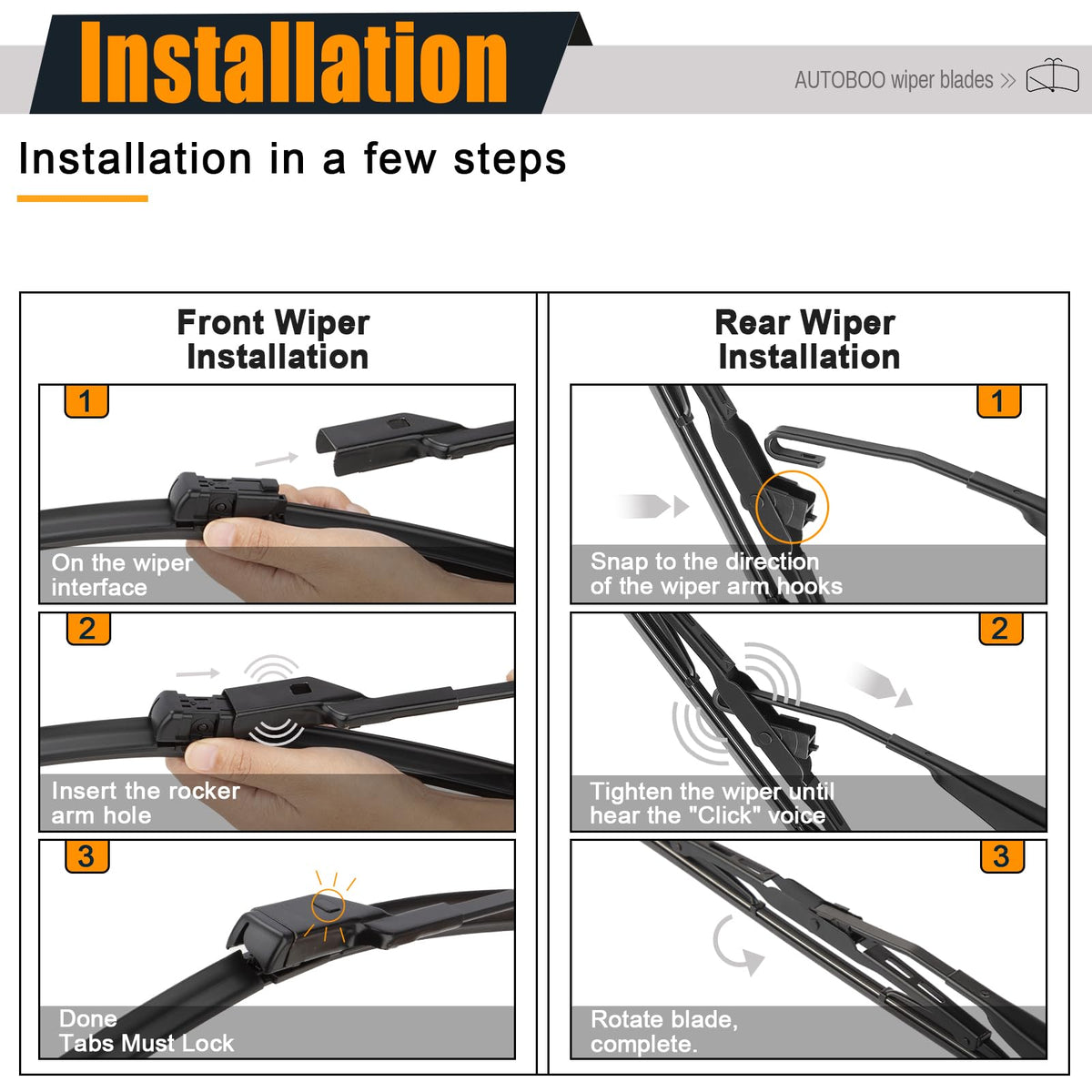 Q: How easy is it to install the AUTOBOO wiper blades?A: The AUTOBOO wiper blades are designed for easy installation. They come with a top lock feature that allows you to quickly and securely fit them onto your car's wiper arm, making the process simple even for beginners.