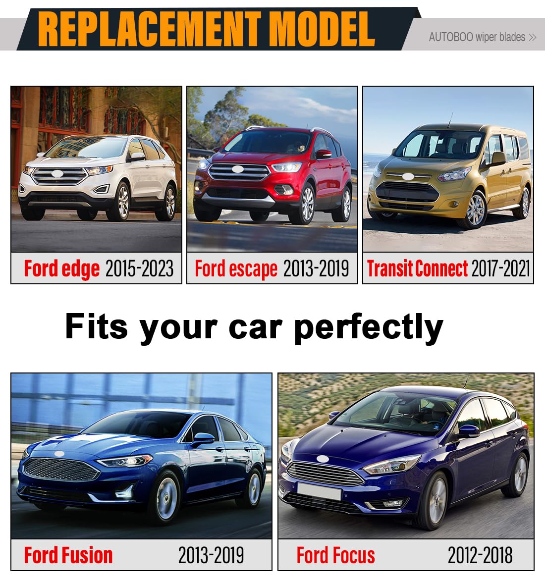 Q: What vehicles are compatible with the AUTOBOO Replacement Wiper Blade Set?A: The AUTOBOO Replacement Wiper Blade Set is compatible with various Ford models, including the 2013-2020 Ford Escape, Ford Edge (2015-2020), Ford Focus (2012-2018), and Ford Fusion (2013-2019). This ensures a perfect fit for your vehicle.