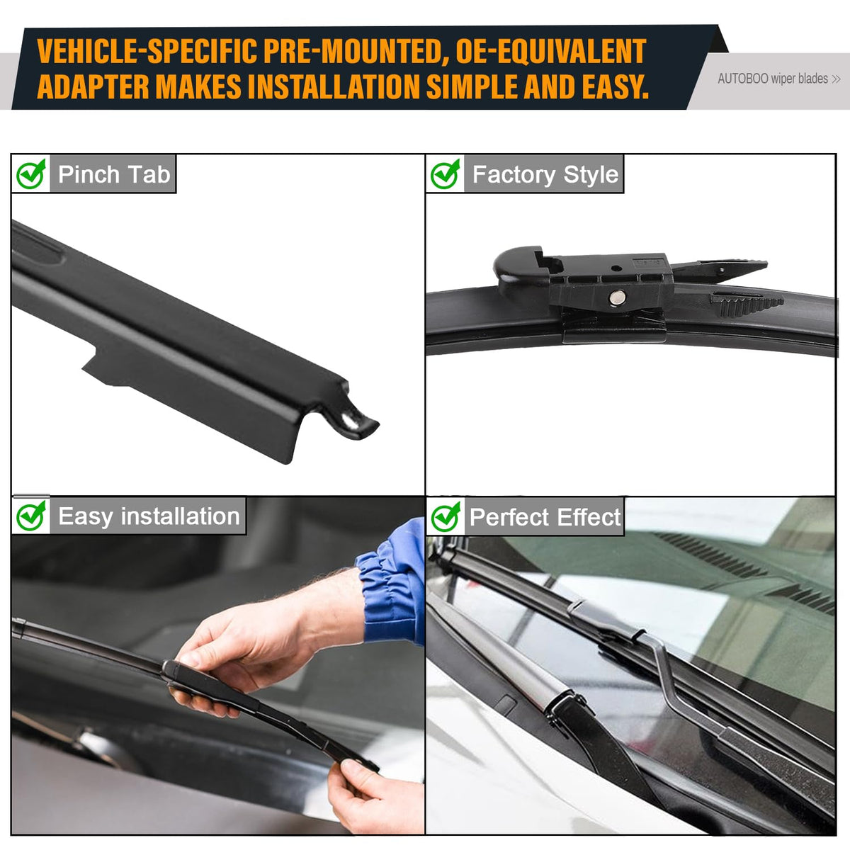 Q: How easy is it to install the AUTOBOO wiper blades?A: Installation of the AUTOBOO wiper blades is straightforward and can be completed quickly. The blades are designed for direct replacement, making it easy to remove the old blades and install the new ones without the need for special tools.
