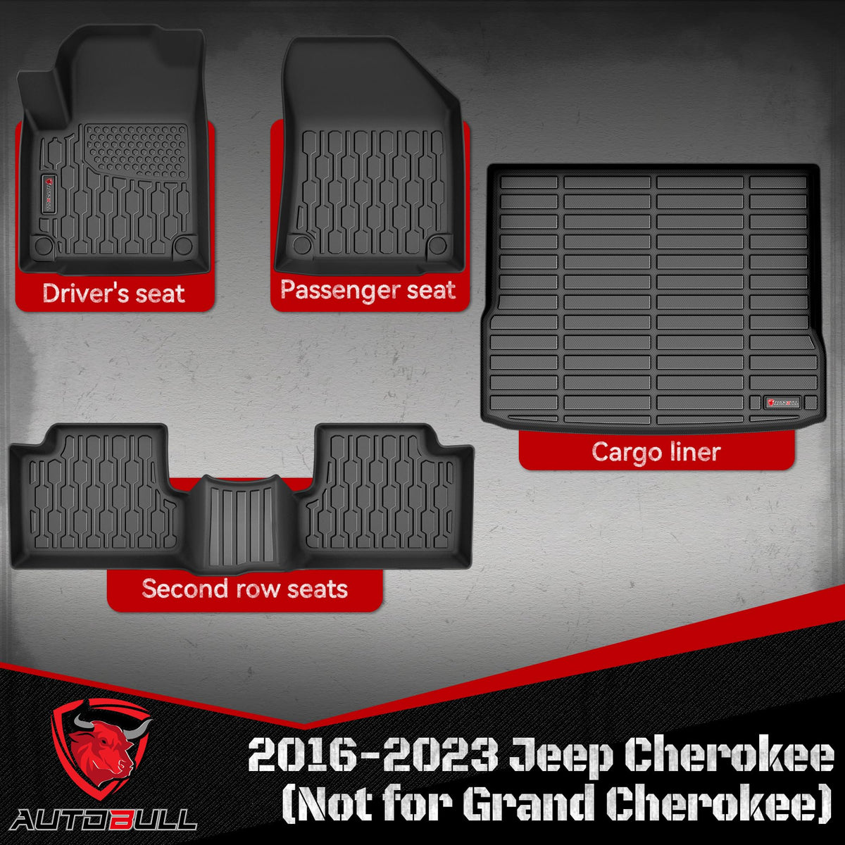 AUTOBULL Floor Mats & Cargo Liner Compatible with 2019-2023 Jeep Cherokee (Not for Grand Cherokee) Cargo Mat,All Weather protection Car Floor Mats 1st, 2nd Row Set & Cargo Mat AUTOBULL floor mats are a customized set of floor mats for your car.Each set of mats is measured by a high-precision laser to ensure that the custom raised edges precisely fit the contours of your vehicle.They are made of TPE material, which is both soft and durable.What's more, they hold up in extreme weather conditions so you don't have to worry about cracking, curling, or damage to your mat.The AUTOBULL floor mats are made of TPE material, which is both soft and durable, provide a clean and comfortable environment for your journey, keeping you happy. With our comprehensive protection and commitment to quality, you can focus on the things that matter most - the joy of driving and the freedom of the open road.