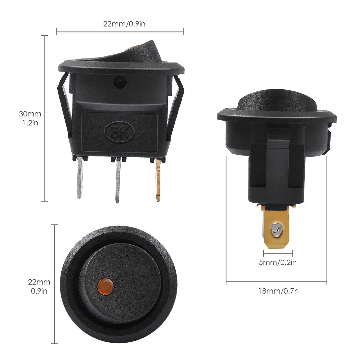 AutoEC Car ON/OFF Switch Specifications: - Polarity: SPST - Material: Plastic - Light source - Light color: yellow - Switch Operation: ON-OFF - Voltage Rating: 12V / DC. 20A. - Applicable for car, motorcycle, boat, water dispenser etc Features: - Easy setup. All you need is a 3/4'' hole and the switch will sit in nicely; no more square cut outs. - Our switch comes with a keyhole slot to prevent unwanted rotation - Made from sturdy material that ensures long lasting durability, facilitate easy installation - For use in a variety of applications including cars, boats, motorcycles, electronics modifications -SPST 2 pole design (On/Off) 3rd poles to be connected to earth Package includes: 3 x Round Rocker Switch