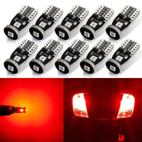 Set of 10 bulbs! 300% bighter than original halogen bulbs, these error free briliant red 194 LED bulbs will give your car a refreshed new look after a 5 minutes easy plug & play installation! AUTOGINE is the Amazon registered brand and we have specialized in LED lights for many years. Our mission is to produce high quality automotive LED light bulbs. We believe in our LEDs and offer ''ONE YEAR'' warranty on item(s) confirm to be manufacturer defect. Specifications: Working Voltage: 12V DC Wattage: 1.5W Length: 0.9 Inches Diameter: 0.35 Inches Polarity sensitive: No Lifespan: 30,000+ Working Hours Cross Reference: T10 147 152 158 159 161 168 175 184 192 193 194 259 280 285 447 464 555 558 585 655 656 657 1250 1251 1252 2450 2652 2825 2921 579 W5W etc. Applications: License Plate Lights, Dome Lights, Map Lights, Side Door Courtesy Lights, Trunk Lights, Cargo Lights. Features: Designed with 3 pieces of high quality 3030 LEDs, twice the amount of light output compared to halogen bulb but requires only 1/3 of the power consumption These T10 LED bulbs are CAN-Bus error free and non-polarity design, just plug and play, your car will not pop up error message after installation. 360-degree lighting angle, no visual blind, no flickering, bring you a bright and comfortable lighting experience. Note: Please double check owners manual or your original halogen bulbs to confirm the size before placing an order. Please note that error free capability may not be compatible to the newest European vehicle and Mercedes Benz newer vehicle.
