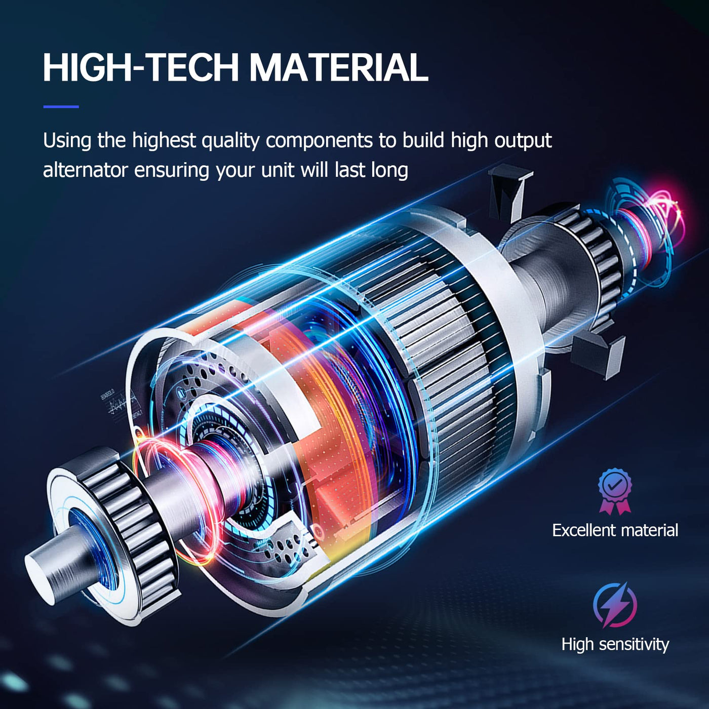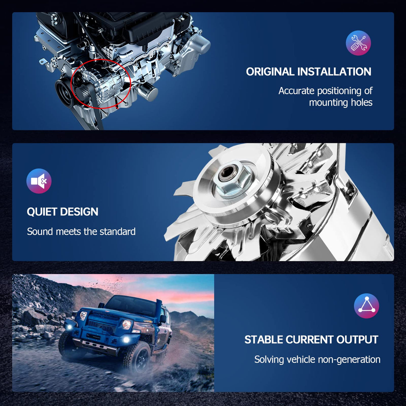 Q: What features differentiate this alternator from others?A: This alternator is designed with high amperage components and is built using top-quality materials. Its one-wire system simplifies installation, and it offers a one-year warranty, ensuring peace of mind for users. Additionally, it runs quietly and efficiently, making it an excellent choice for performance upgrades.