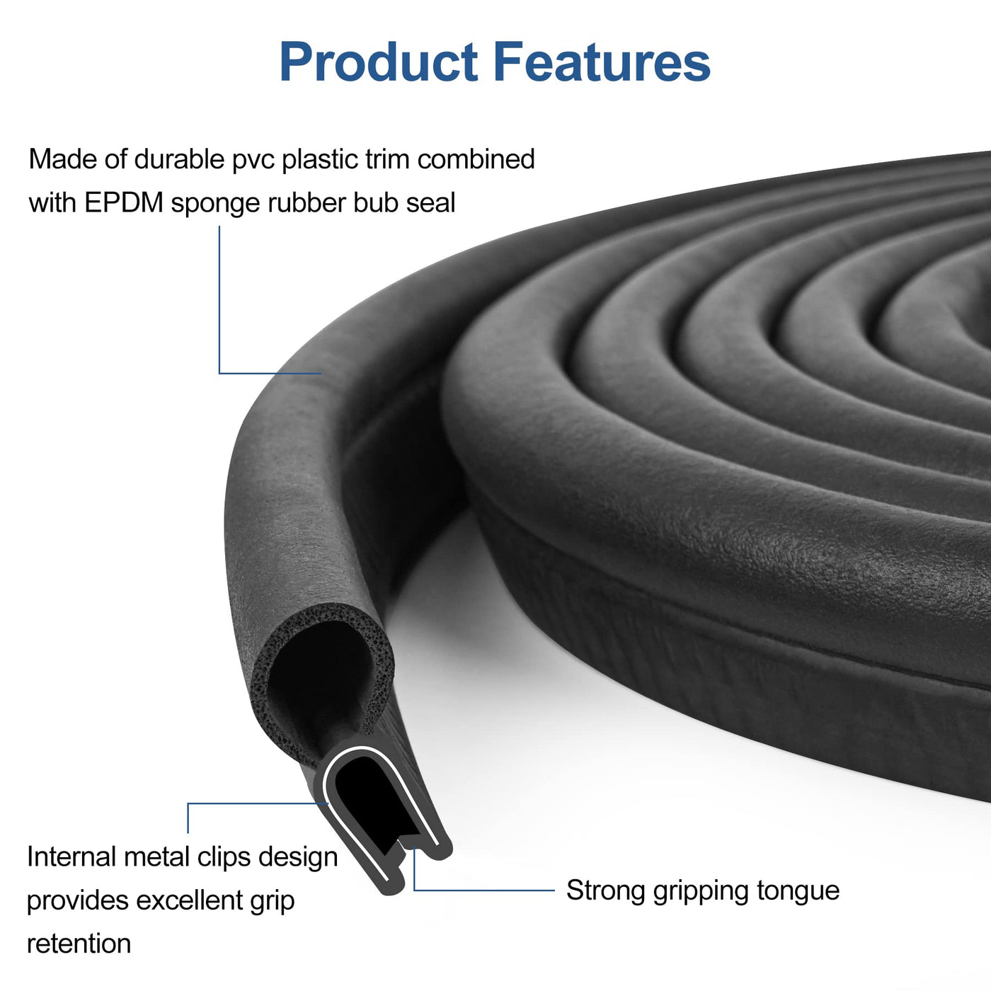 ?Product Structure and Size?This car door rubber seal strip is 10ft. U Shape PVC Trim adopts the high-quality internal metal clips structure provides excellent grip retention to promise a stable and strong grip, and the EPDM rubber top bulb provides a secure seal for a variety of applications. ?Weather Resistance?The rubber bulb seal can provide excellent protection against heat, corrosion and extreme weather damage. High temperature and cold resistance, protection against ultraviolet light. ?Safe And Durable?This car door rubber seal adopts excellent EPDM rubber and PVC plastic to protect your vehicle, and effectively play a role in noise reduction, eliminate vibration, waterproof, dustproof , soundproof and windproof. ?Installation?Durable EPDM foam rubber contains internal metal clips to grip permanent around the install place and excellent grip retention. It easy to install, not need to adhesive, just push-on trim seal allows for a fast installation. ?Wide Range of Application?The car door seal strip suitable for all kinds of vehicles, trucks, trailers, trains,ships, aircrafts; various doors and windows, building; various electrical cabinets, generators, metal plates.
