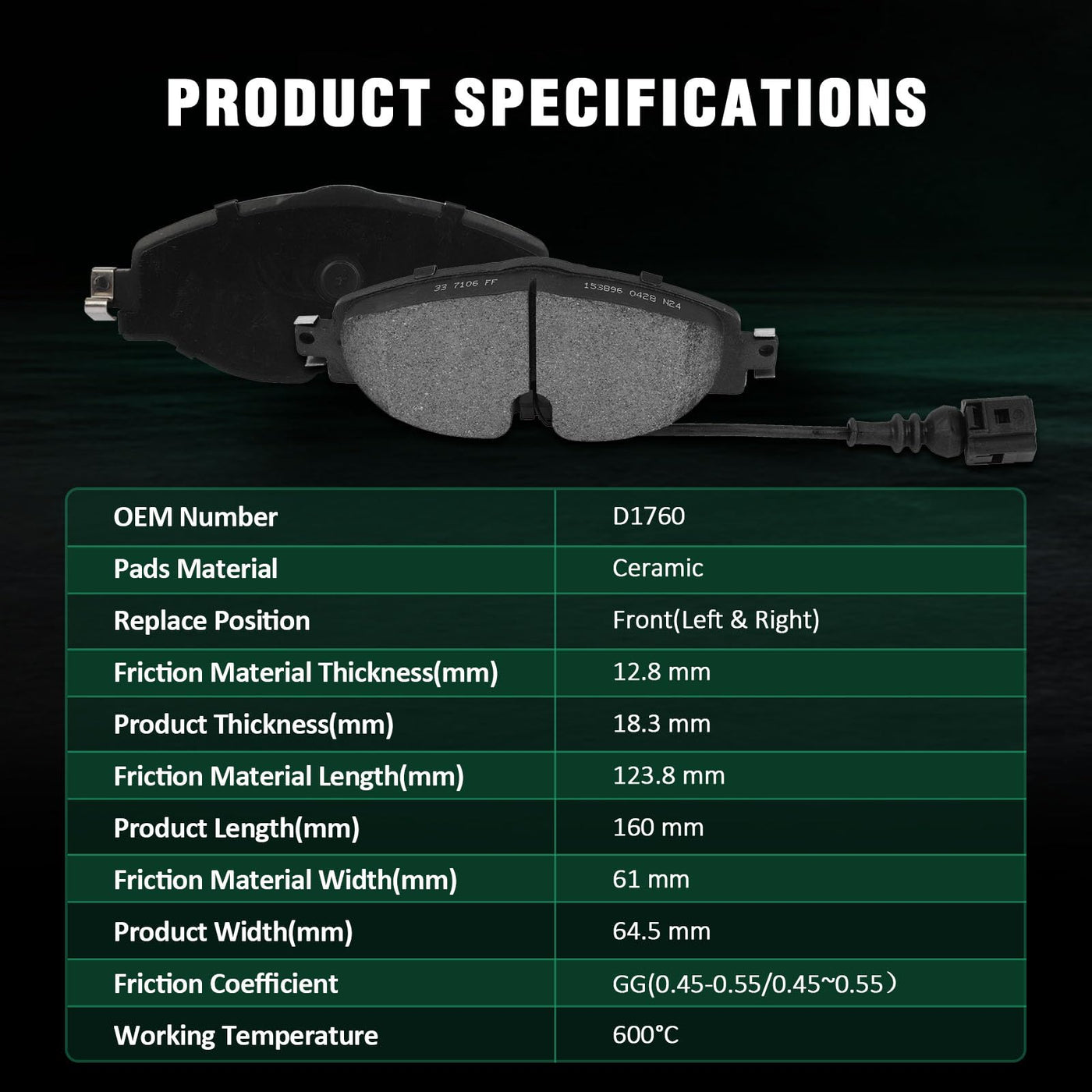 Automuto 4Pcs Front Brake Pads D1760 For Audi A3 15-16/A3 Quattro 15-16/Tt Quattro 16-20, For Volkswagen Golf 15-21/Alltrack 17-