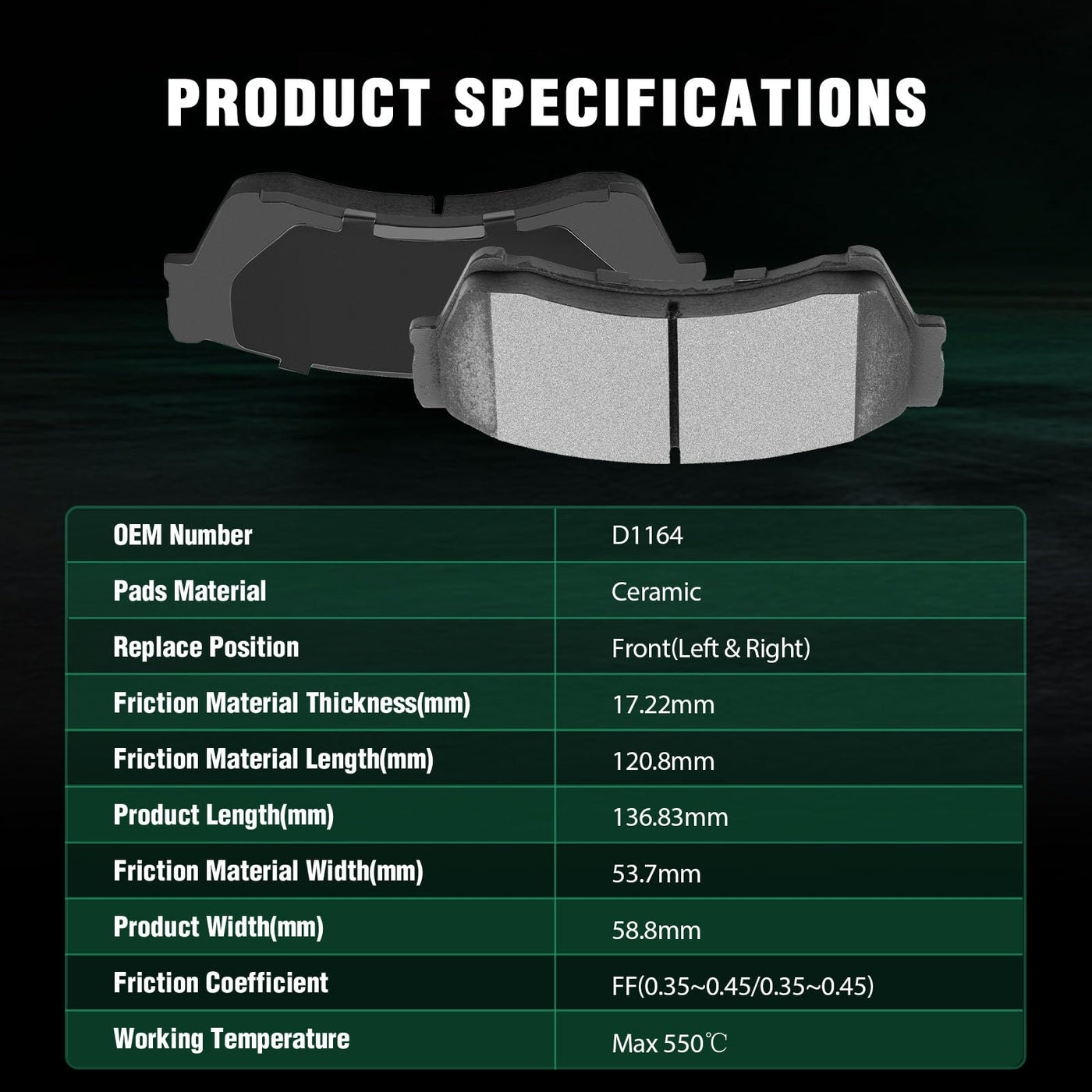 Fits:2006-2010 For Ford For Fusion 2.3L2010-2012 For Ford For Fusion 2.5L2006-2012 For Ford For Fusion 3.0L2010-2012 For Ford For Fusion 3.5L2007-2012 For Lincoln MKZ 3.5L2006 For Lincoln Zephyr 3.0L2006-2008 For Mazda 6 2.3L2009-2013 For Mazda 6 2.5L2006-2008 For Mazda 6 3.0L2009-2013 For Mazda 6 3.7L2006-2009 For Mercury Milan 2.3L2010-2011 For Mercury Milan 2.5L2006-2011 For Mercury Milan 3.0LSpecifications:1)Placement on Vehicle: Front Left and Right2)Brake Pad Material: Ceramic3)OEM Part Numbers: ATD1164C,D1164-8277Package Including:4*Ceramic Disc Brake Pads Set