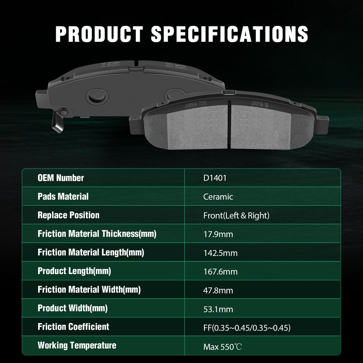 Fits:2009-2016 For Toyota Venza 2.7L2009-2016 For Toyota Venza 3.5LSpecifications:1)Placement on Vehicle: Front Left and Right2)Brake Pad Material: Ceramic3)OEM Part Numbers: D1401-8509Package Including:4*Ceramic Disc Brake Pads Set