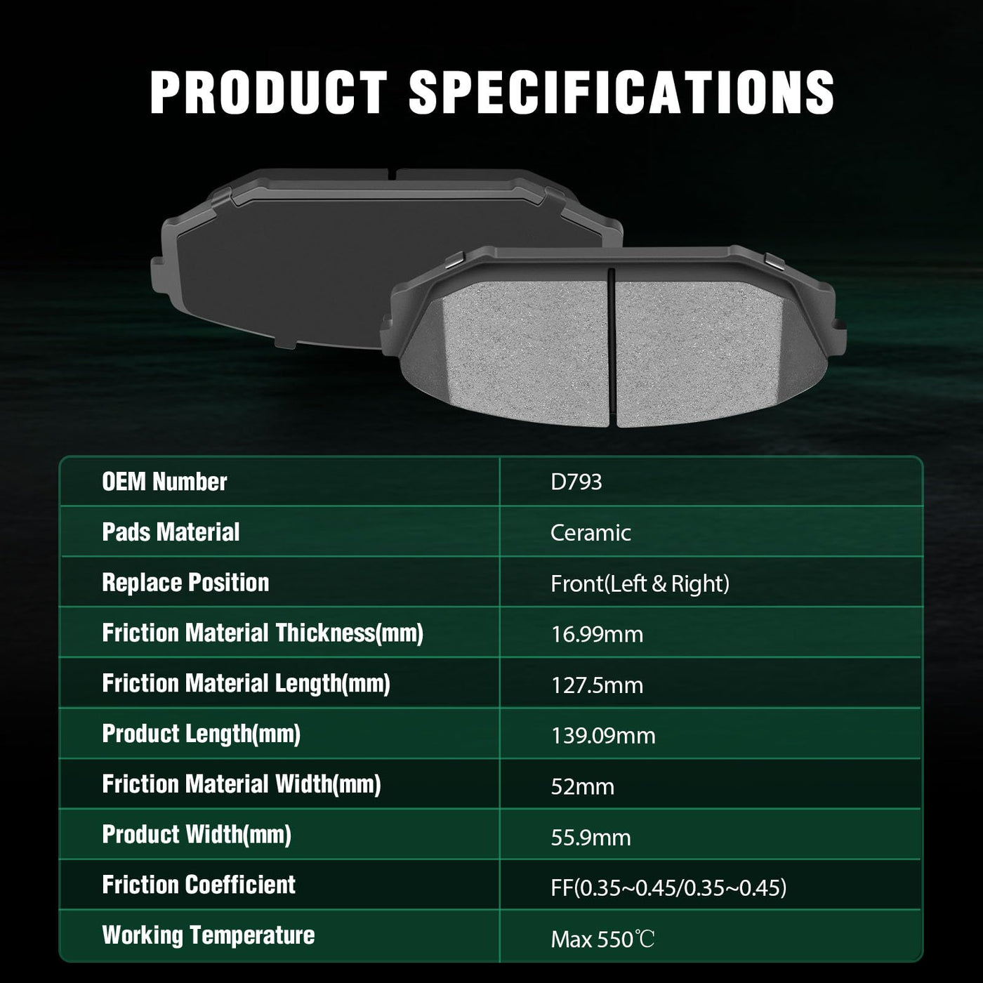 Fits:2001-2002 For Acura MDX 3.5L1999-2004 For Honda Odyssey 3.5LSpecifications:1)Placement on Vehicle: Front Left and Right2)Brake Pad Material: Ceramic3)OEM Part Numbers: ATD793C,D793-7663Package Including:4*Ceramic Disc Brake Pads Set