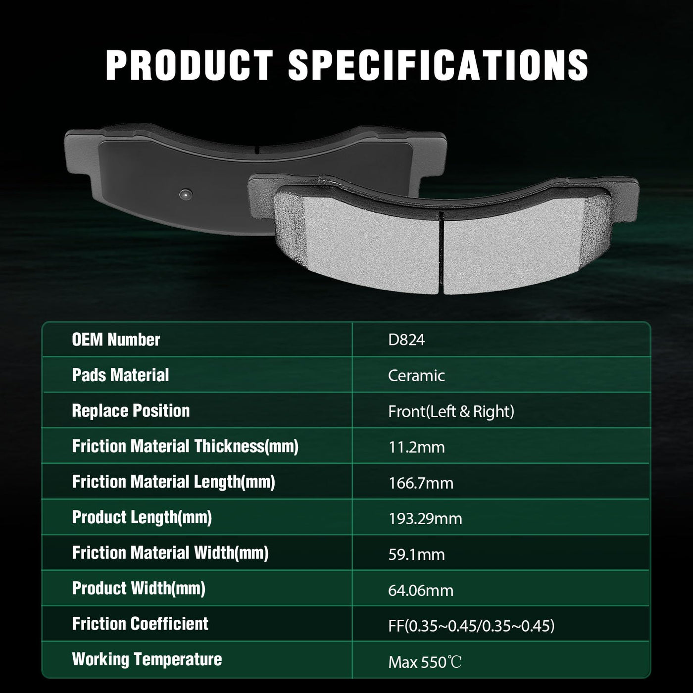 Fits:2000-2005 For Ford For Excursion 5.4L2003-2005 For Ford For Excursion 6.0L2000-2005 For Ford For Excursion 6.8L2000-2003 For Ford For Excursion 7.3L1999-2004 For Ford For F-250 Super Duty 5.4L2003-2004 For Ford For F-250 Super Duty 6.0L1999-2004 For Ford For F-250 Super Duty 6.8L1999-2003 For Ford For F-250 Super Duty 7.3L1999-2004 For Ford For F-350 Super Duty 5.4L2003-2004 For Ford For F-350 Super Duty 6.0L1999-2004 For Ford For F-350 Super Duty 6.8L1999-2003 For Ford For F-350 Super Duty 7.3LSpecifications:1)Placement on Vehicle: Front Left and Right2)Brake Pad Material: Ceramic3)OEM Part Numbers: ATD824C,D824-7625Package Including:4*Ceramic Disc Brake Pads Set