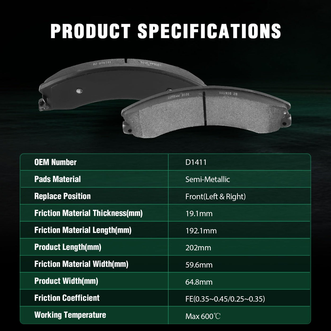 Fits:2017 For Chevrolet Express 3500 2.8L2009-2017 For Chevrolet Express 3500 4.8L2009-2017 For Chevrolet Express 3500 6.0L2009-2016 For Chevrolet Express 3500 6.6L2009-2016 For Chevrolet Express 4500 6.0L2009-2016 For Chevrolet Express 4500 6.6L2011-2017 For Chevrolet Silverado 2500 HD 6.0L2011-2017 For Chevrolet Silverado 2500 HD 6.6L2011-2017 For Chevrolet Silverado 3500 HD 6.0L2011-2017 For Chevrolet Silverado 3500 HD 6.6L2017 For GMC Savana 3500 2.8L2009-2017 For GMC Savana 3500 4.8L2009-2017 For GMC Savana 3500 6.0L2009-2016 For GMC Savana 3500 6.6L2009-2016 For GMC Savana 4500 6.0L2009-2016 For GMC Savana 4500 6.6L2015 For GMC Sierra 1500 4.3L2015 For GMC Sierra 1500 5.3L2015 For GMC Sierra 1500 6.2L2011-2016 For GMC Sierra 2500 HD 6.0L2011-2016 For GMC Sierra 2500 HD 6.6L2011-2016 For GMC Sierra 3500 HD 6.0L2011-2016 For GMC Sierra 3500 HD 6.6L2012-2017 For Nissan NV1500 4.0L2012-2017 For Nissan NV2500 4.0L2012-2017 For Nissan NV2500 5.6L2012-2017 For Nissan NV3500 4.0L2012-2017 For Nissan NV3500 5.6LSpecifications:1)Placement on Vehicle: Front Left and Right/Rear Left and Right2)Brake Pad Material: Semi-Metallic3)OEM Part Numbers: D1411-8523Package Including:4*Semi-Metallic Disc Brake Pads Set