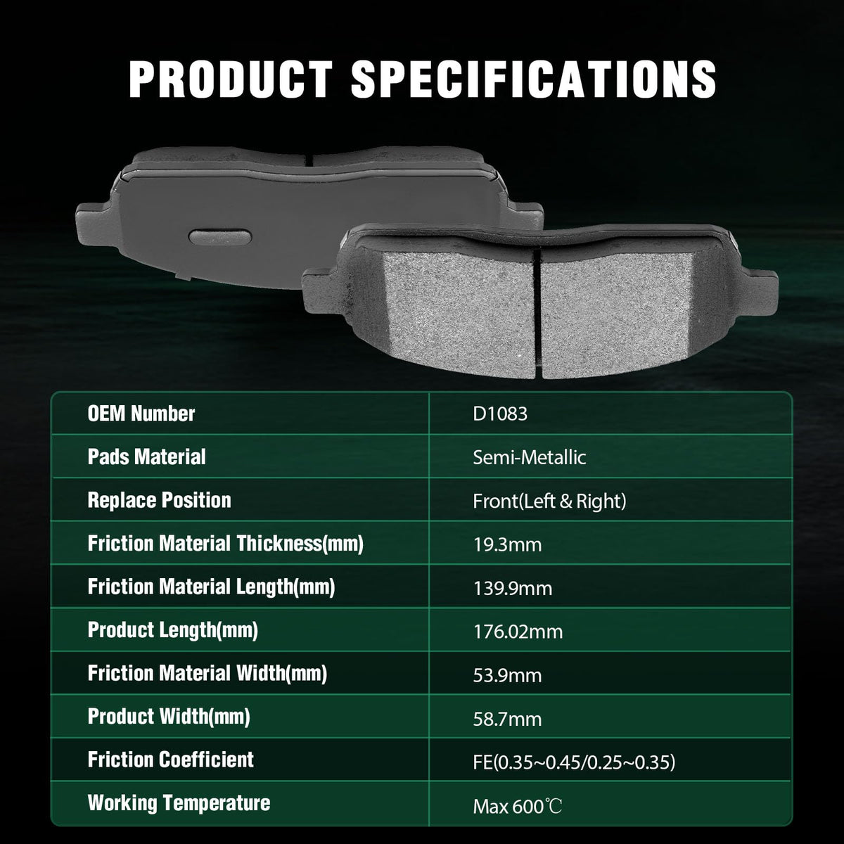 Fits:2004-2009 For Ford For F-150 4.2L2004-2009 For Ford For F-150 4.6L2004-2009 For Ford For F-150 5.4L2006-2008 For Lincoln Mark LT 5.4LSpecifications:1)Placement on Vehicle: Front Left and Right2)Brake Pad Material: Semi-Metallic3)OEM Part Numbers: ATD1083C,D1083-7915Package Including:4*Semi-Metallic Disc Brake Pads Set