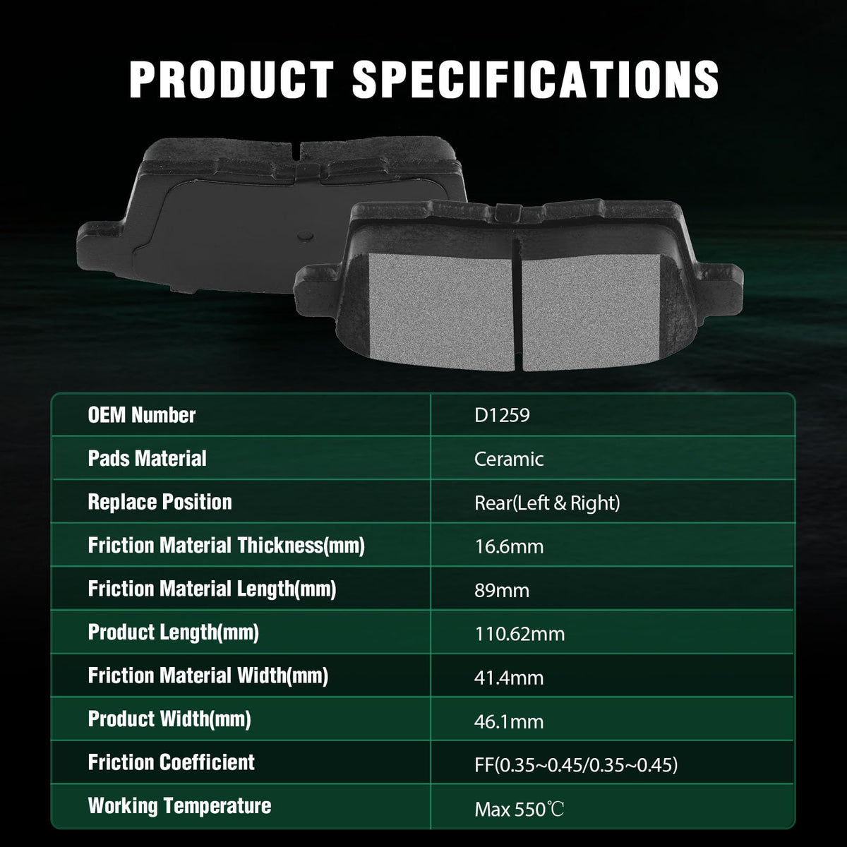 Fits:2007-2010 For Ford For Edge 3.5L2007-2010 For Lincoln MKX 3.5L2007-2012 For Mazda CX-7 2.3L2010-2012 For Mazda CX-7 2.5L2007 For Mazda CX-9 3.5L2008-2015 For Mazda CX-9 3.7LSpecifications:1)Placement on Vehicle: Rear Left and Right2)Brake Pad Material: Ceramic3)OEM Part Numbers: ATD1259C,D1259-8378Package Including:4*Ceramic Disc Brake Pads Set