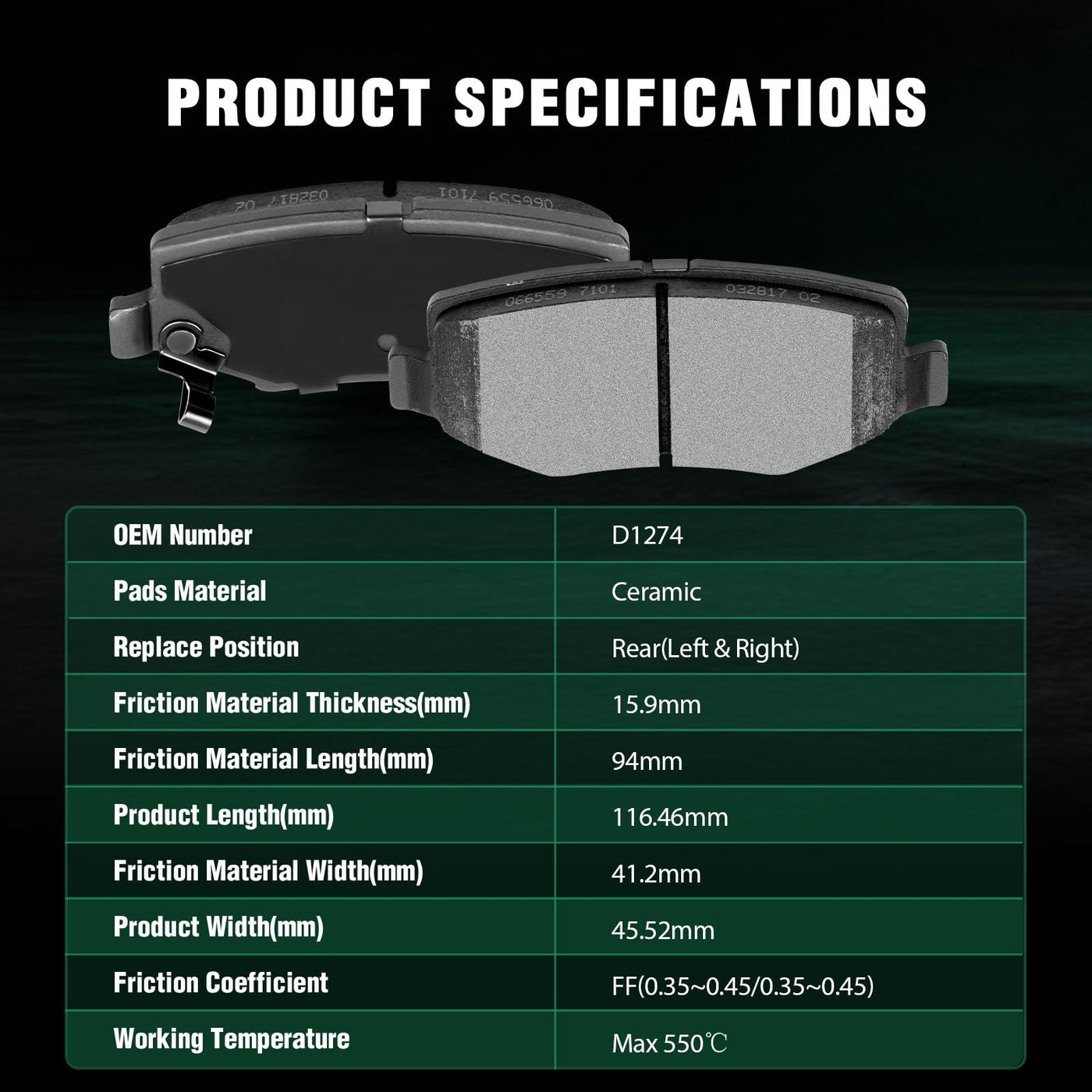 Automuto 4Pcs Rear Ceramic Disc Brake Pads Set D1274 For Dodge Nitro 2007-2011, For Jeep Liberty 2008-2012, Jeep Wrangler 2007-2