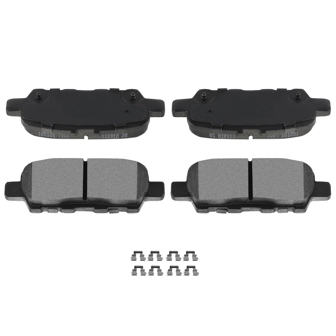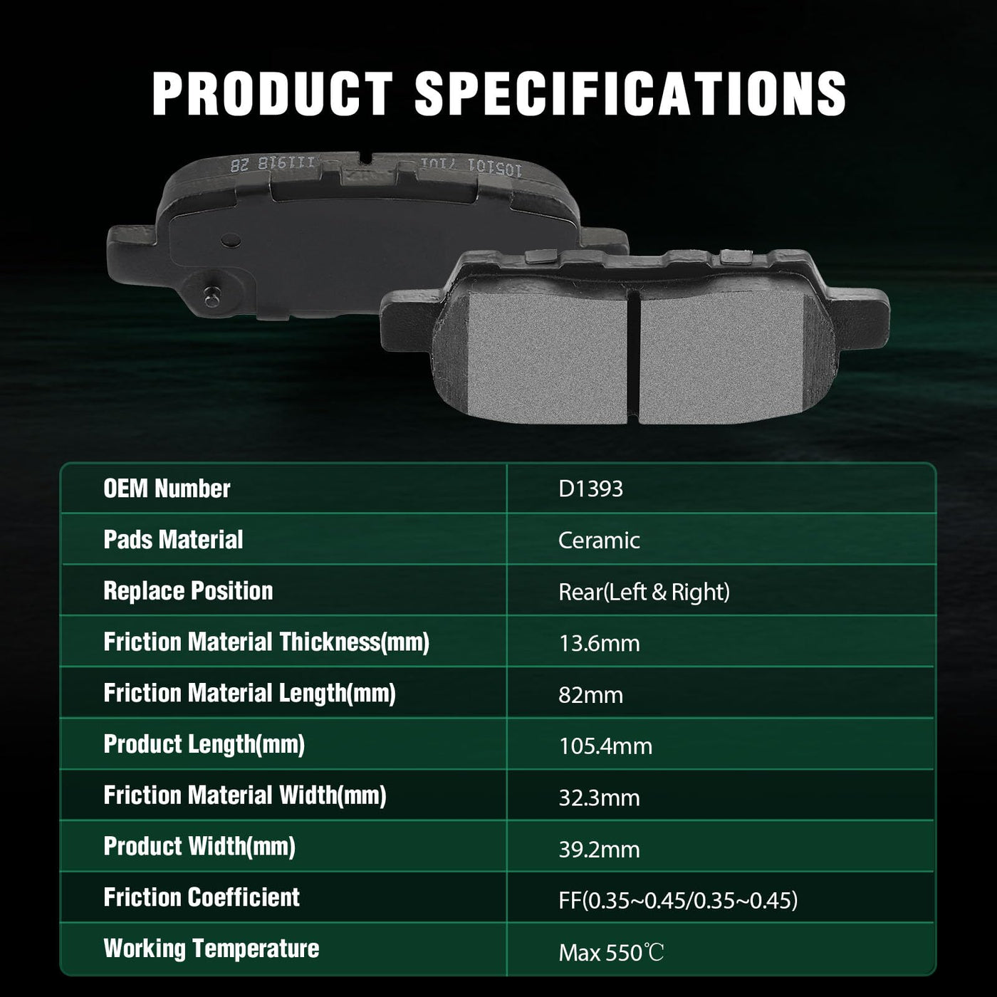 Fits:2013 For INFINITI JX35 3.5L2014-2020 For INFINITI QX60 3.5L2020 For Nissan Murano --2010-2021 For Nissan Murano 3.5L2013-2020 For Nissan Pathfinder 3.5L2011-2017 For Nissan Quest 3.5L2009-2013 For Suzuki Grand Vitara 2.4L2009-2010 For Suzuki Grand Vitara 3.2LSpecifications:1)Placement on Vehicle: Rear Left and Right2)Brake Pad Material: Ceramic3)OEM Part Numbers: D1393-8501,D1415-8405Package Including:4*Ceramic Disc Brake Pads Set