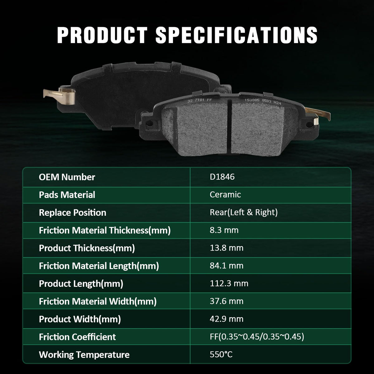 Automuto 4Pcs Rear Ceramic Disc Brake Pads Set D1846 For Mazda Cx-5 2016-2021