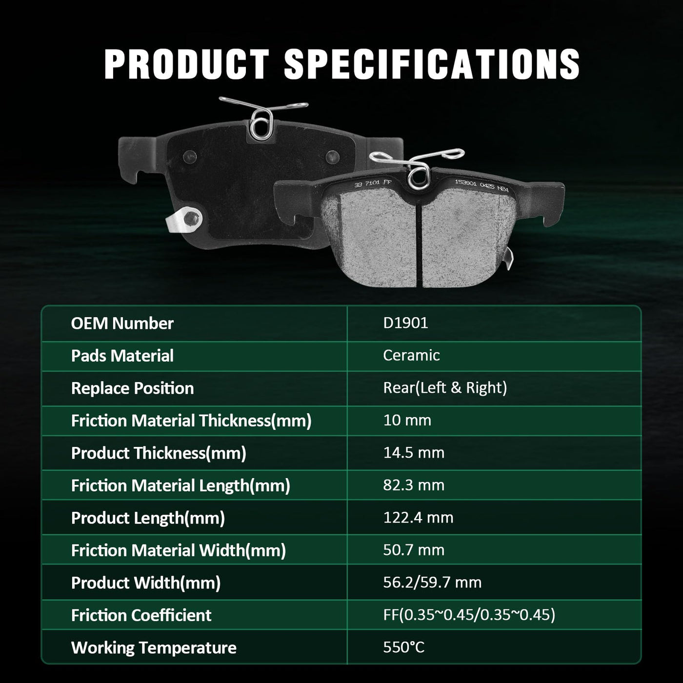 Fits:For Chrysler Pacifica 2017-2023For Chrysler Voyager 2020-2023Specifications:1)Placement on Vehicle: Rear2)Brake Pad Material: Ceramic3)OEM Part Numbers: D1901-9128Package Including:4*Ceramic Disc Brake Pads Set
