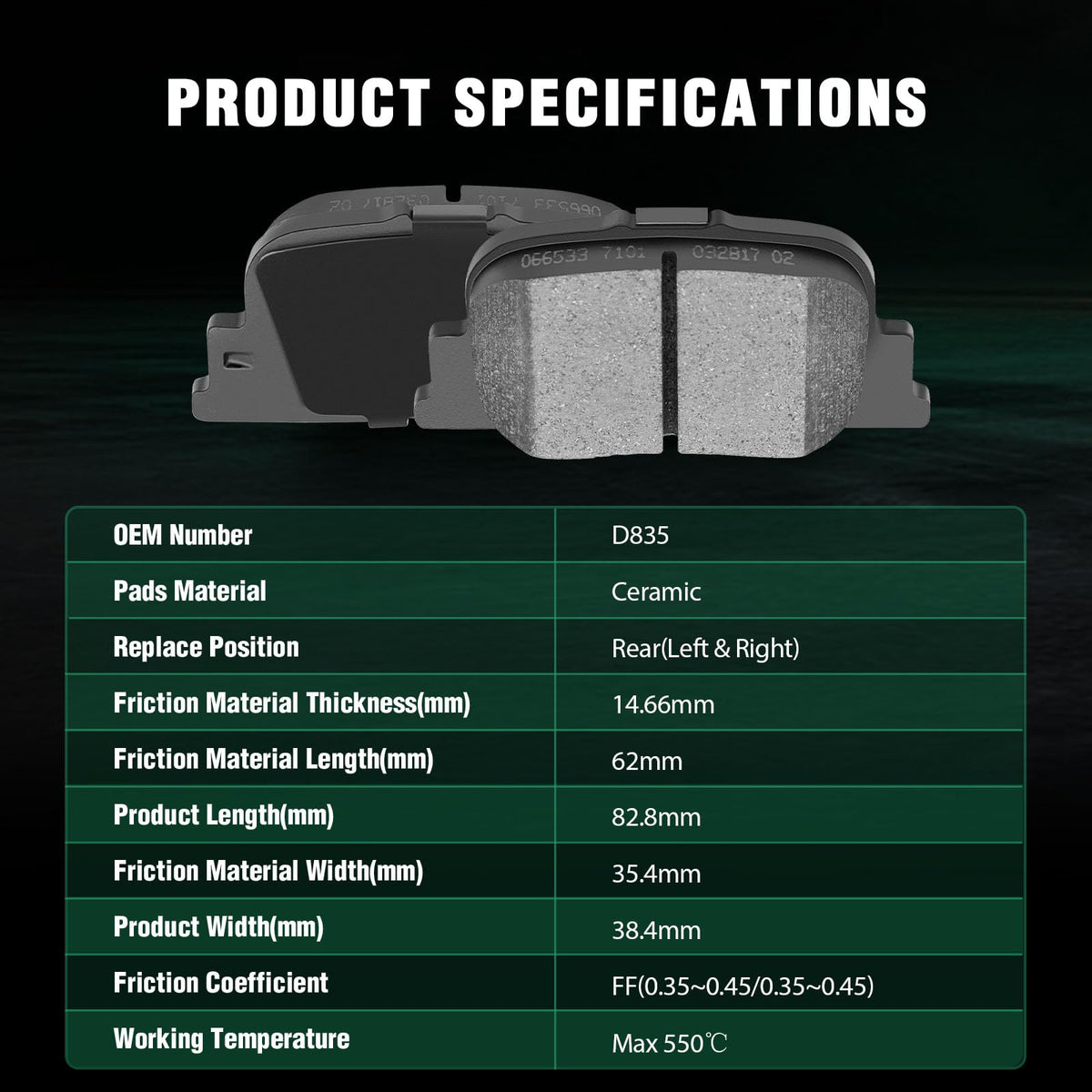Automuto 4Pcs Rear Ceramic Disc Brake Pads Set D835 For Lexus Es300 2000-2001,For Scion Tc 2010,For Toyota For Camry 2000-2001