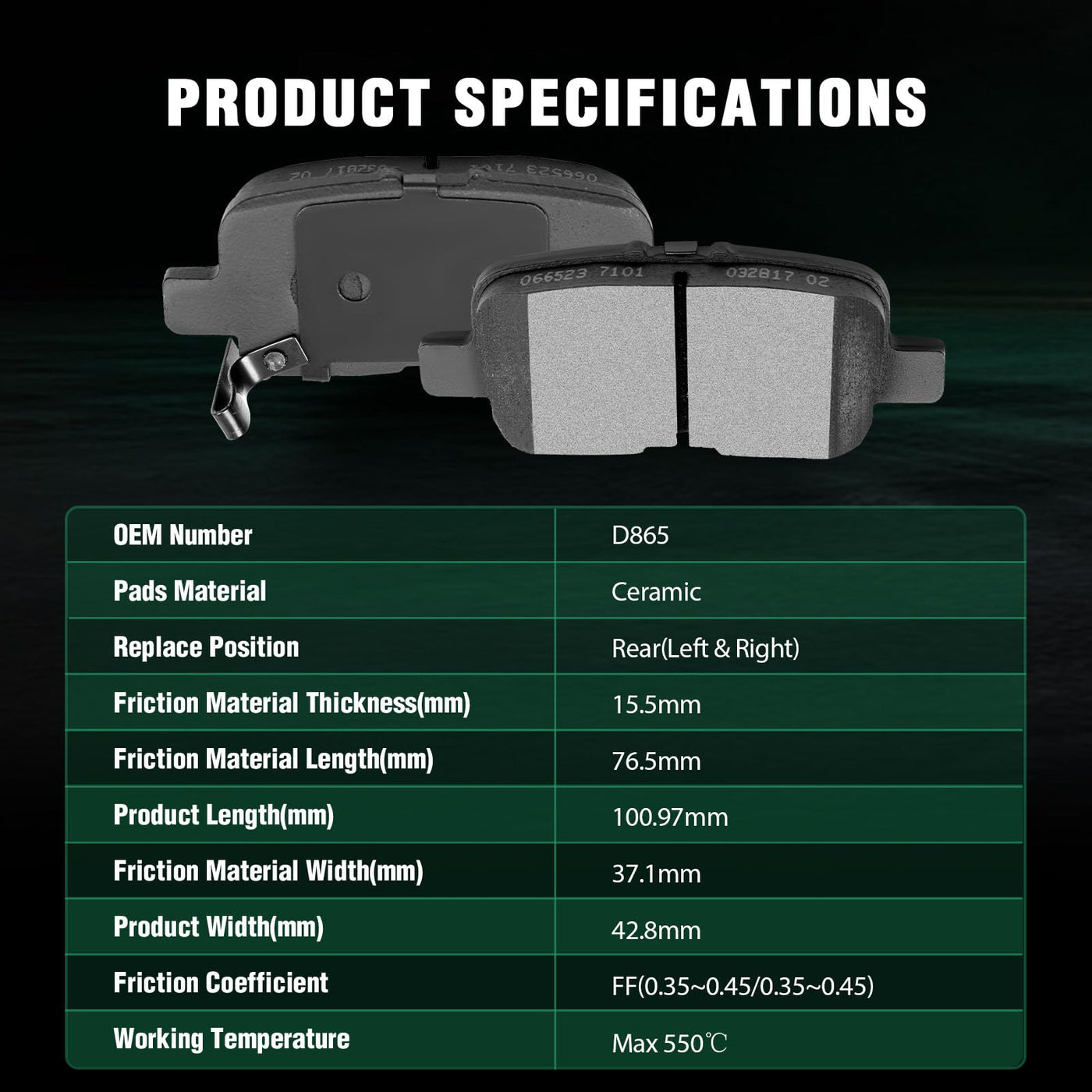 Fits:2001-2006 For Acura MDX 3.5L2002-2004 For Honda Odyssey 3.5L2003-2008 For Honda Pilot 3.5LSpecifications:1)Placement on Vehicle: Rear Left and Right2)Brake Pad Material: Ceramic3)OEM Part Numbers: ATD865C,D865-7740Package Including:4*Ceramic Disc Brake Pads Set