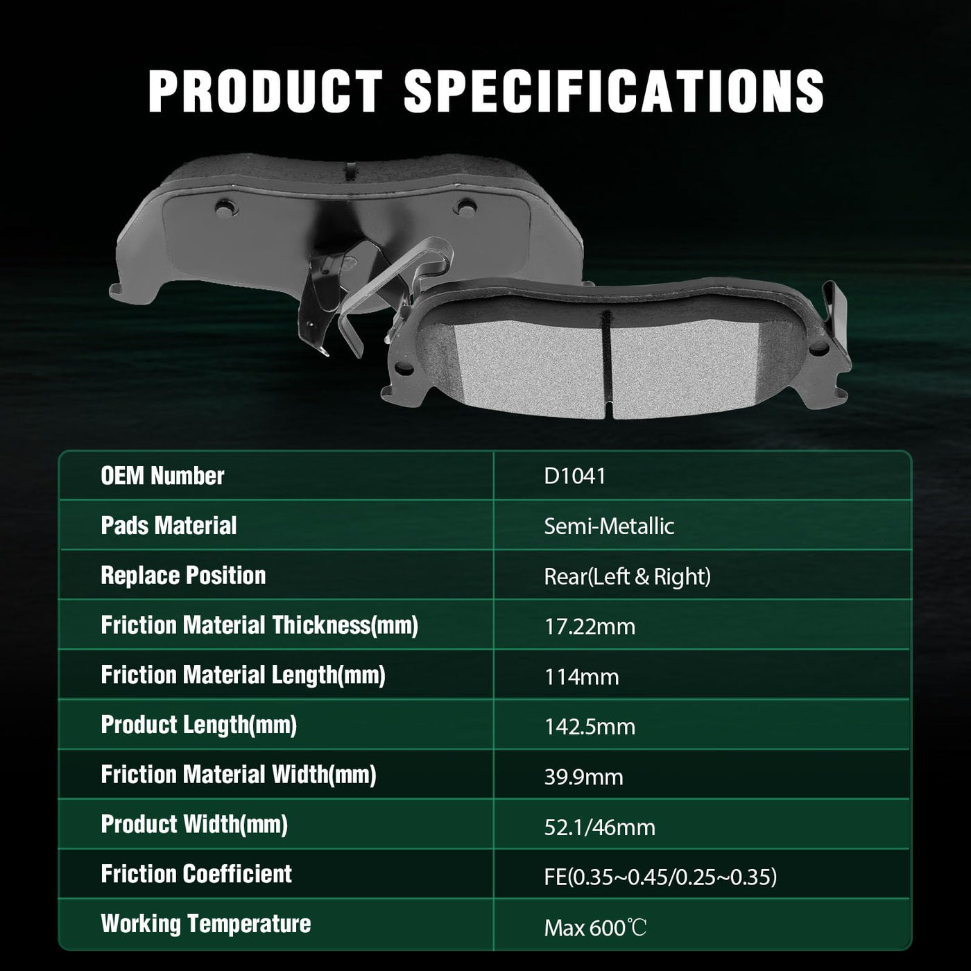 Fits:2005-2015 2017-2018 For Nissan Armada 5.6L2004 For Nissan Pathfinder Armada 5.6LSpecifications:1)Placement on Vehicle: Rear Left and Right2)Brake Pad Material: Semi-Metallic3)OEM Part Numbers: ATD1041C,D1041-7945Package Including:4*Semi-Metallic Disc Brake Pads Set